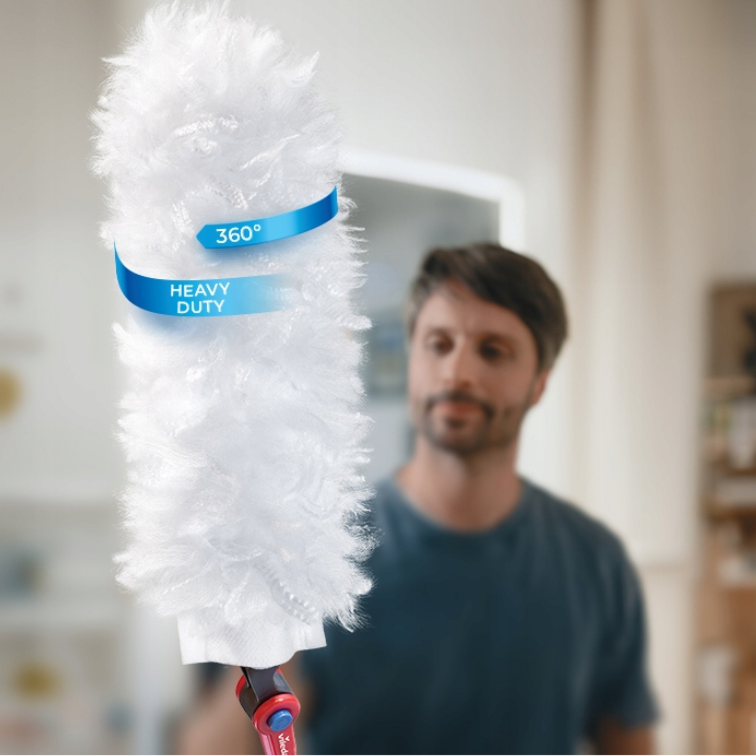 Zrównoważone sprzątanie możliwe jest dzięki wkładom z włóknami wykonanymi z materiału w 100% z recyklingu*, które podnoszą jakość sprzątania i wspierają ochronę planety. Konstrukcja 360 – włókna dookoła wkładu gwarantują, że kurz znika z każdej strony, a wbudowany haczyk utrzymuje wkład na miejscu. * Wkład składa się również z nieprzetworzonych materiałów i oleju.