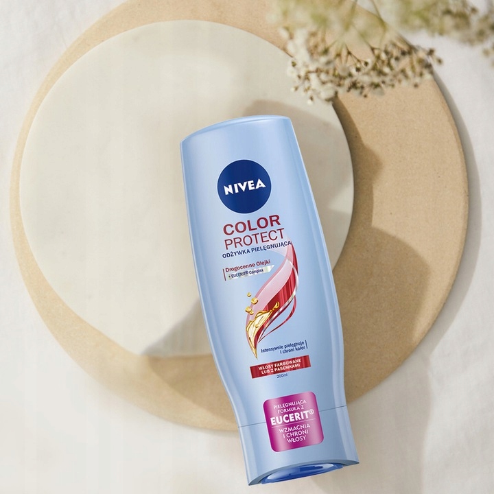 Zapewnij farbowanym włosom odpowiednią pielęgnację, w trosce o ich kolor- postaw na Odżywkę chroniącą kolor NIVEA Color Brilliance! Biodegradowalna formuła* odżywki do włosów z ekstraktem z jagód Acai i keratyną intensywnie pielęgnuje skórę głowy i włosy, dbając o zachowanie intensywności ich koloru. Odżywka do włosów farbowanych ma optymalne dla skóry głowy pH, a jej formuła jest wolna od silikonu i mikroplastiku**. Odżywka NIVEA intensywnie pielęgnuje farbowane włosy i chroni blask ich koloru na dłużej. Butelka odżywki została stworzona w 96% z materiałów z recyklingu (z wyłączeniem etykiet). Stworzona z myślą o tym, byś mogła cieszyć się intensywnym kolorem włosów na dłużej! NIVEA Color Brilliance - dla pięknych włosów i zdrowej skóry głowy!