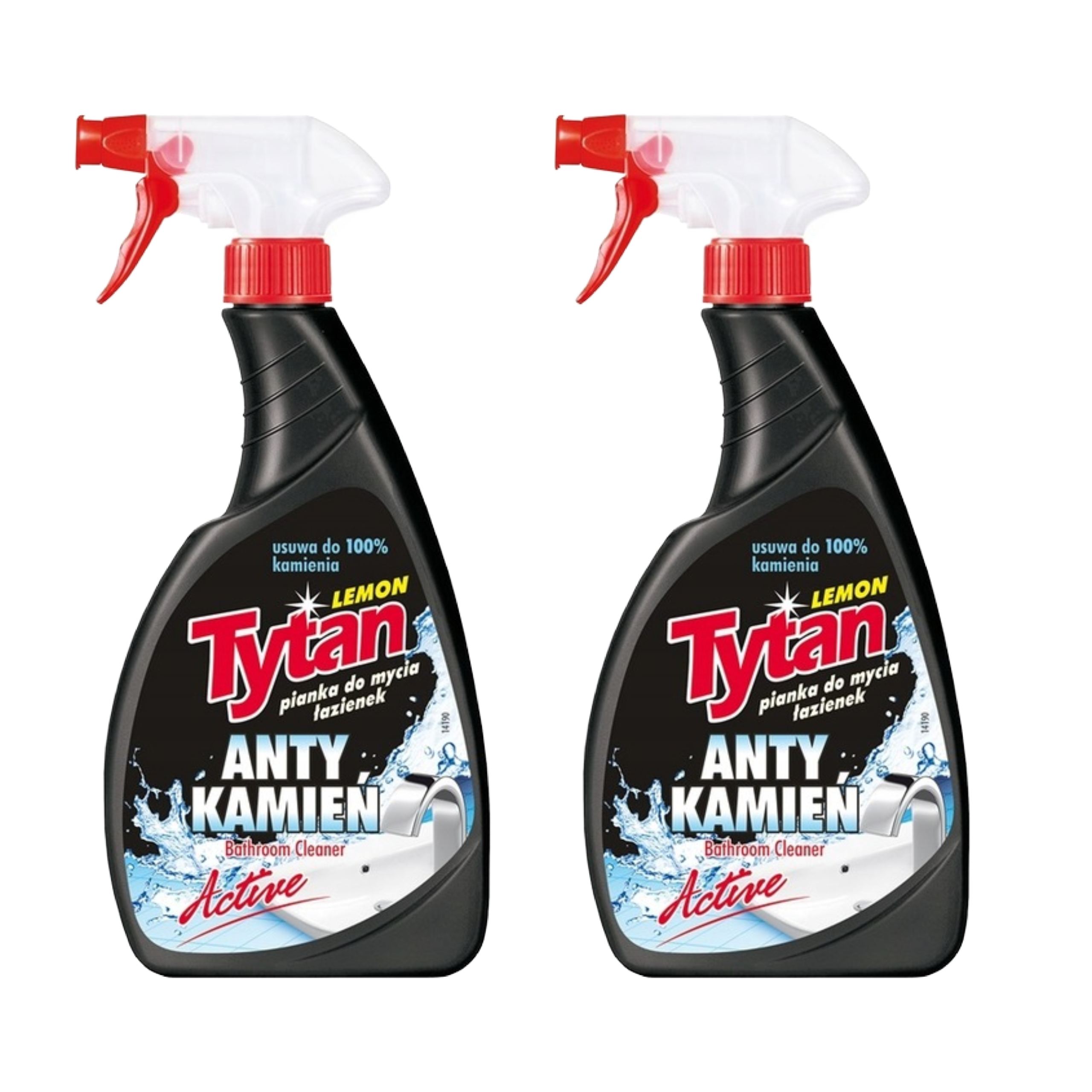 Pianka do mycia łazienek Tytan skutecznie usuwa osady z kamienia, rdzy, mydła, zacieki wodne, tłuste plamy i inny brud. Przeznaczona jest do mycia powierzchni z chromu, stali nierdzewnej (zlewozmywaki kuchenne), glazury, umywalki, wanny, szkła, plastiku (kabiny prysznicowe), armatury łazienkowej i inne.
