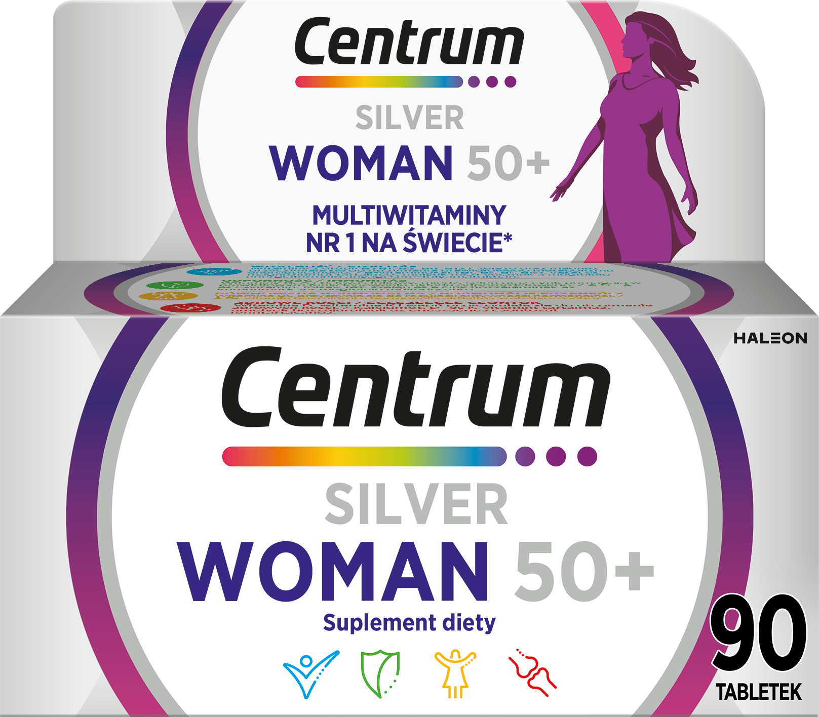 Suplementy diety Centrum Woman 50+ to kompletny zestaw witamin i minerałów dopasowany do potrzeb dla kobiet w wieku 50+. W miarę upływu lat zmieniają się nie tylko nawyki żywieniowe, ale także zapotrzebowanie organizmu na pewne składniki odżywcze. Dlatego tak ważne jest ich prawidłowe uzupełnianie. Zastanawiasz się czy warto brać witaminy Centrum? Odpowiedź brzmi TAK! Zaawansowana formuła Centrum Woman 50+ zawiera w swoim składzie witaminy z grupy B (witaminy B6, B12), magnez oraz fosfor, które przyczyniają się do utrzymania prawidłowego metabolizmu energetycznego. Zawarty w suplemencie diety wapń oraz witamina D i K są potrzebny do utrzymania zdrowych kości. Z kolei biotyna i cynk pomagają zachować zdrową skórę i włosy, a selen – zdrowe paznokcie.