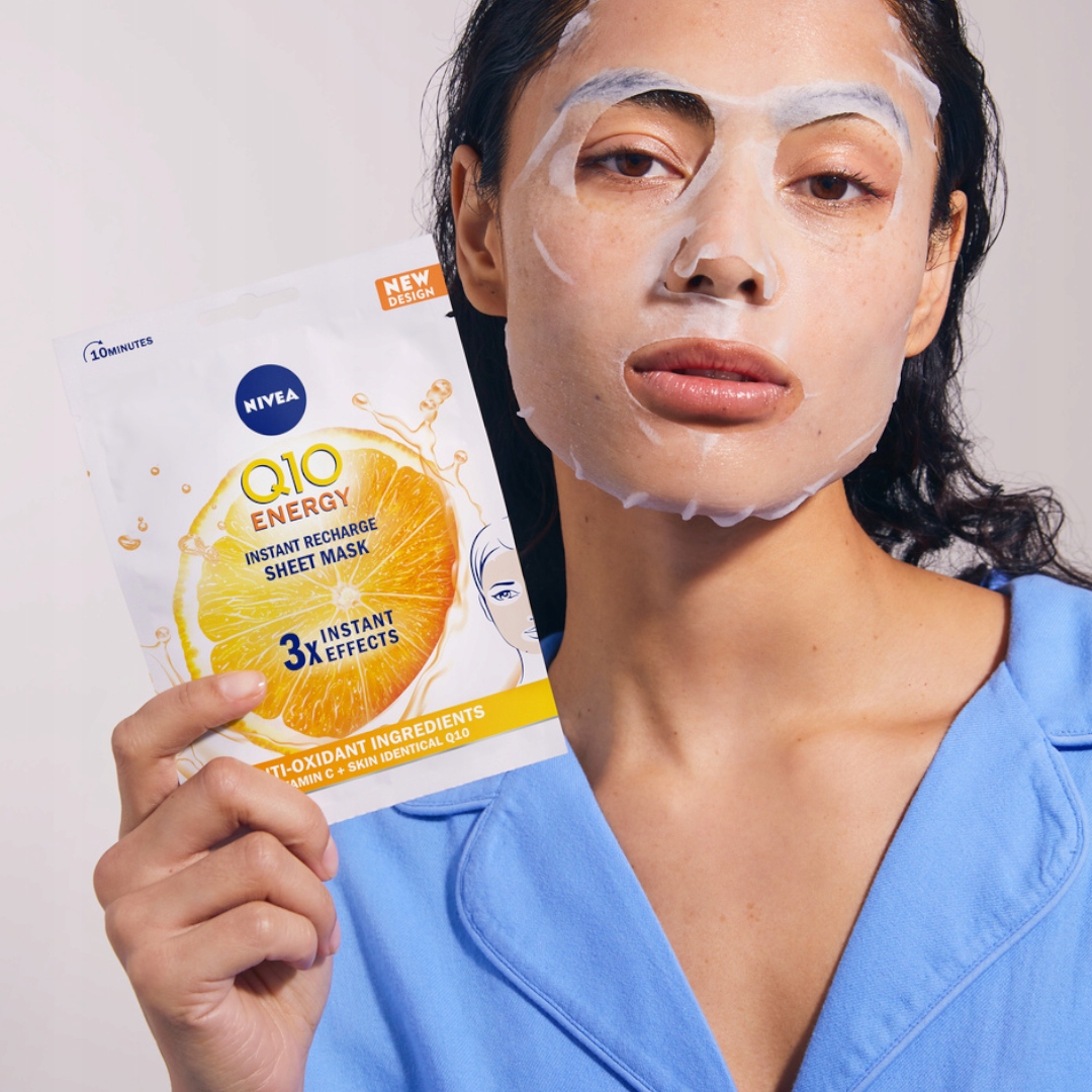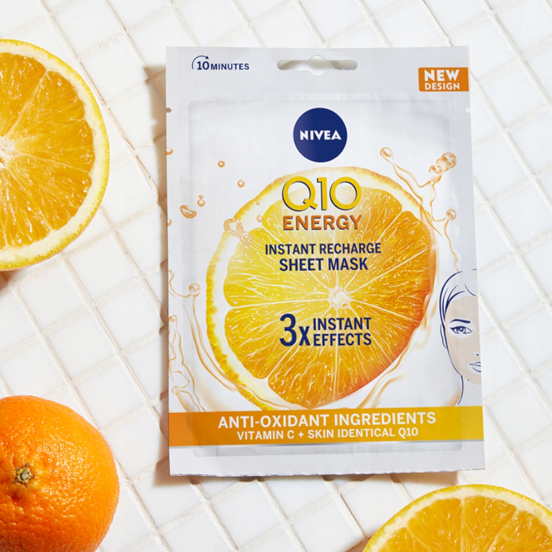 Poznaj NIVEA Q10 ENERGY 10-minutową Maskę w płachcie, dzięki której Twoja skóra zyska niesamowitą świeżość i blask. Maska w płachcie z linii NIVEA Q10 ENERGY z formułą łączącą siłę dwóch przeciwutleniaczy: koenzymu Q10 identycznego jak w Twojej skórze i Witaminy C to natychmiastowa dawka energii, którą możesz podarować swojej skórze. W przeciągu 10 minut zniweluje oznaki zmęczenia i stresu widocznego na skórze. Intensywnie nawilży i rozświetli skórę. To idealny sposób na relaks dla skóry, dodatkową dawkę pielęgnacji lub przygotowanie skóry do dalszych zabiegów pielęgnacyjnych. To doładowanie energetyczne dla Twojej skóry, by była promienna i pełna blasku.