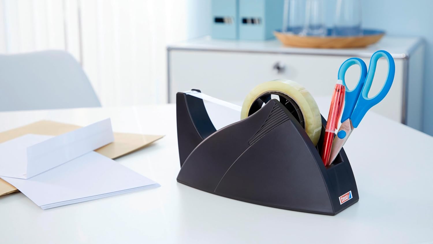 Dozownik stołowy z tesa® Professional to funkcjonalne urządzenie w nowoczesny stylu. Niezwykle stabilny do profesjonalnej obróbki taśmy samoprzylepnej. Dzięki innowacyjnej technologi rolkę można zmienić w prosty sposób. Gładki nóż zapewnia lekkie proste cięcie. Z wbudowanym uchwytem na pióro.
