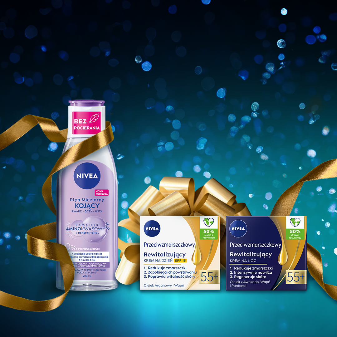 Podaruj zestaw NIVEA Beauty Care dla kobiet 55+! Zestaw zawiera przeciwzmarszczkowe kremy do twarzy na dzień oraz na noc, dla kompleksowej pielęgnacji twarzy po 55 roku życia. Formuły kremów z linii NIVEA Przeciwzmarszczkowy + Rewitalizujący poprawiają kontur twarzy i redukują zmarszczki. To idealny zestaw prezentowy dla kobiet. Tolerancja dla skóry potwierdzona dermatologicznie.