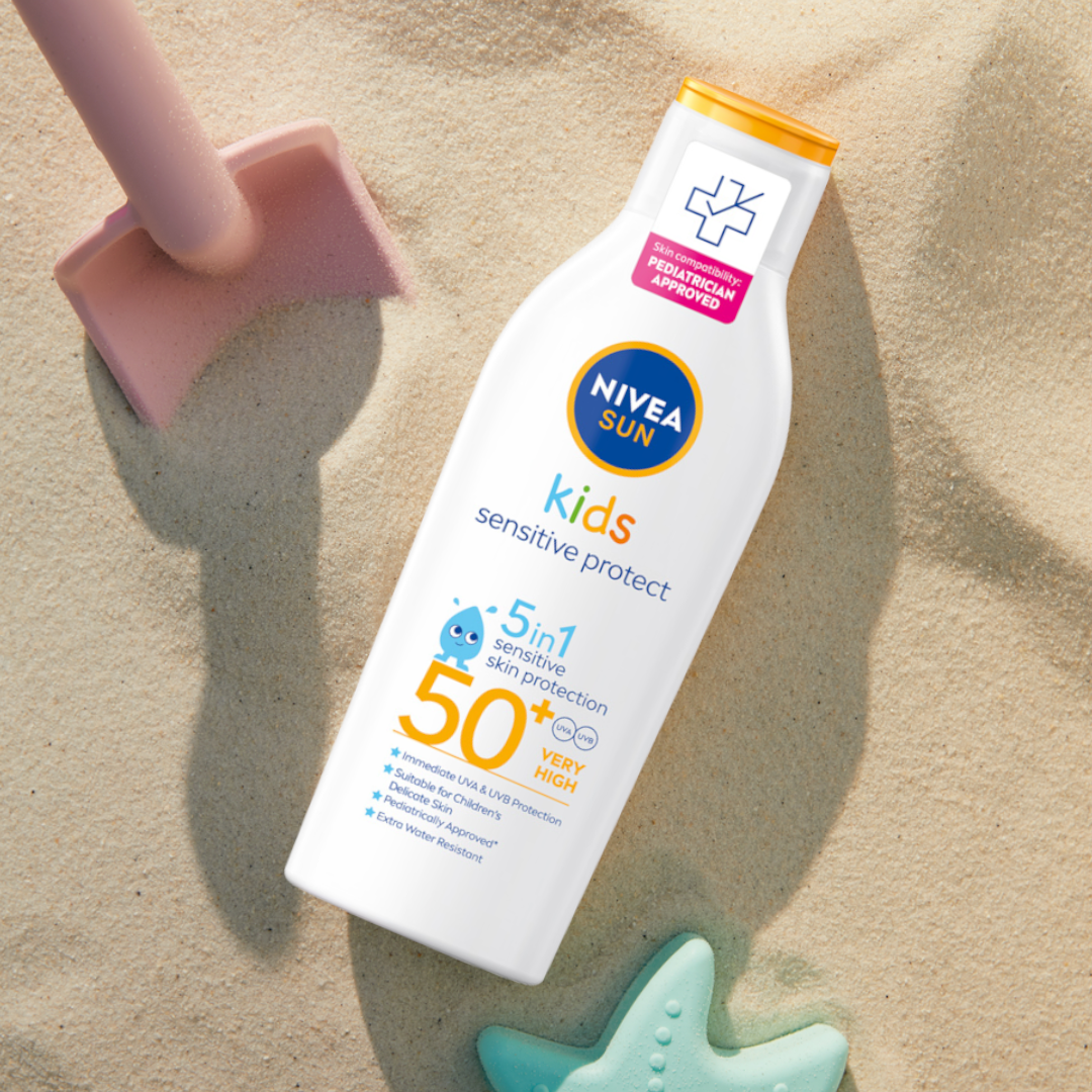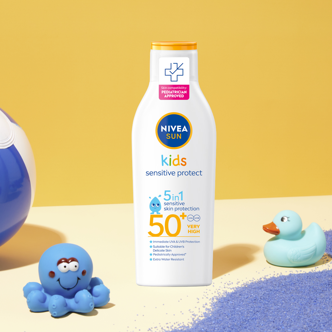 NIVEA SUN Balsam do opalania dla dzieci Sensitive Protect SPF50+ zapewnia ochronę skóry przed oparzeniami słonecznymi i długotrwałymi uszkodzeniami spowodowanymi promieniowaniem UV. Zmniejsza ryzyko alergii słonecznych i jest wysoce wodoodporny. Przeznaczony dla wrażliwej skóry dzieci, także tej ze skłonnościami do egzemy, powyżej 6 miesiąca życia. Bez kompozycji zapachowych. Formuła biodegradowalna w 62%.