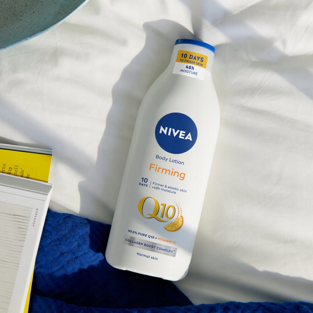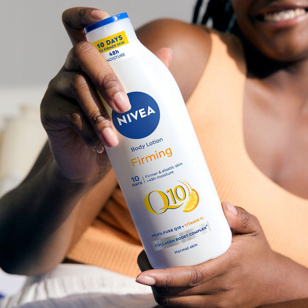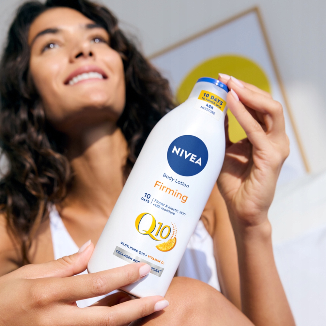 Ujędrniający balsam do ciała NIVEA® Q10 został wzbogacony o dwa silne antyoksydanty - koenzym Q10 i witaminę C. Udoskonalona formuła zauważalnie ujędrnia i poprawia sprężystość skóry już po 10 dniach stosowania! Ujędrniający balsam do ciała szybko się wchłania i przyjemnie pachnie. Intensywnie nawilża skórę przez 48 godzin oraz sprawia, że jest przyjemnie miękka, gładka w dotyku i wygląda zdrowo. Postaw na pielęgnację z ujędrniającym balsamem od NIVEA! Jak uzyskać najlepszy efekt ujędrniający, by zobaczyć efekty już po 10 dniach? Stosuj codziennie na całe ciało. Delikatnie wmasuj mleczko w skórę.