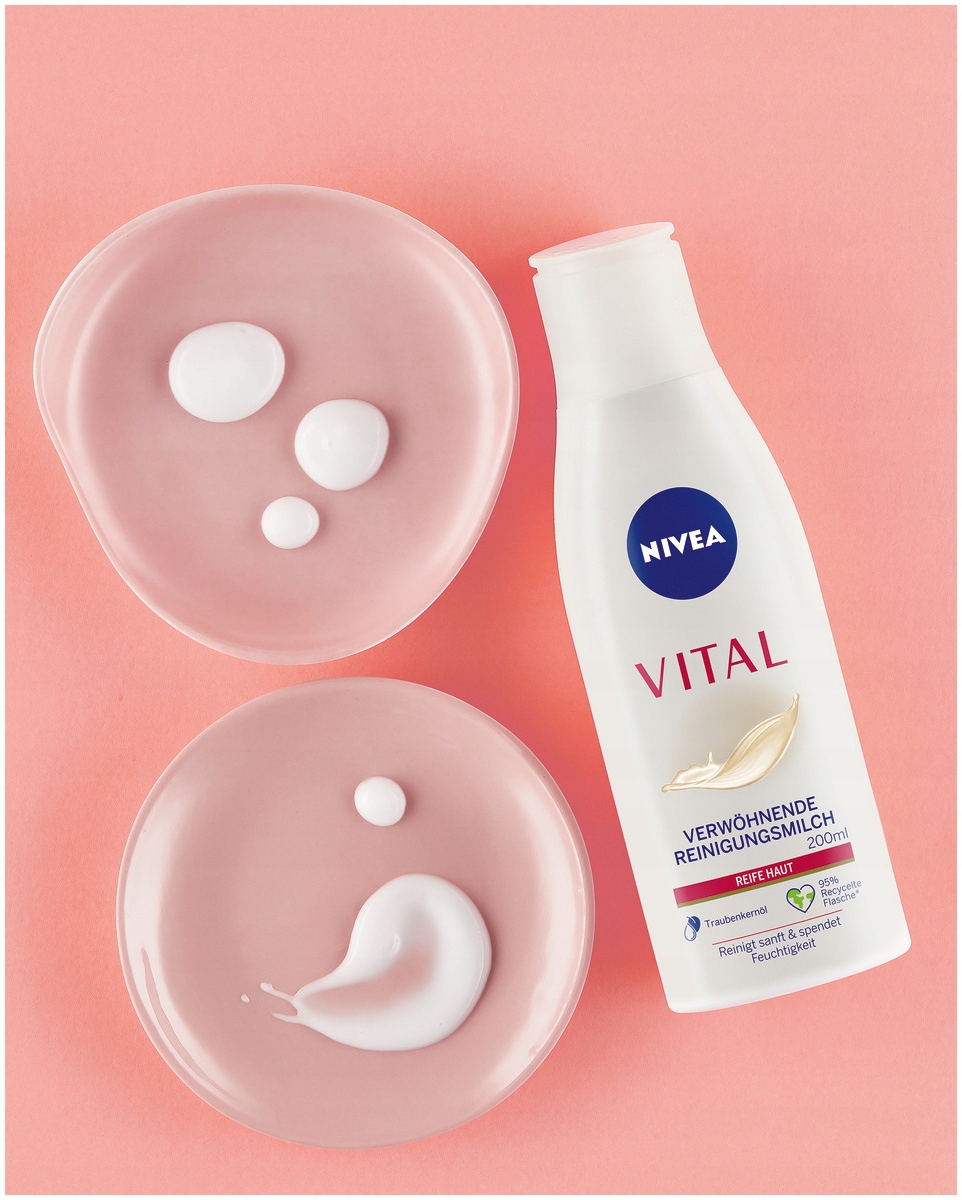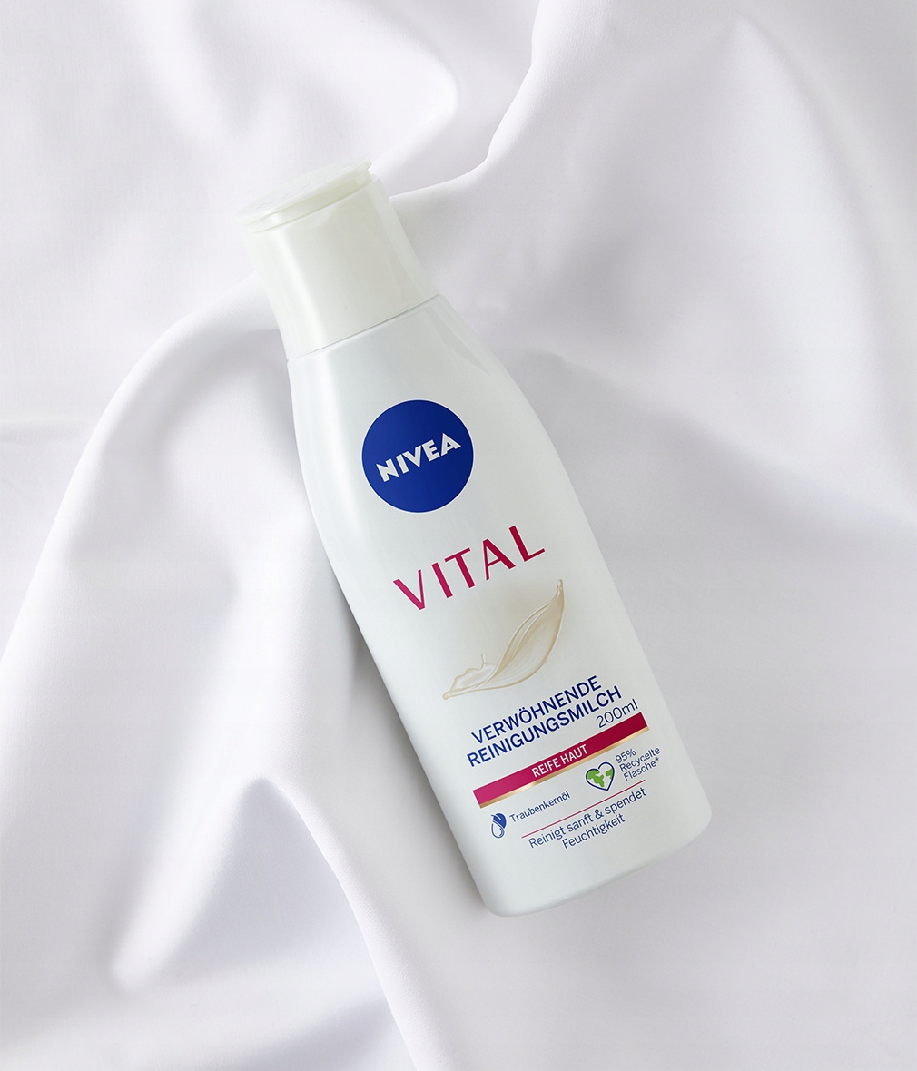 By uzyskać jeszcze lepsze efekty, stosuj w połączeniu z innymi produktami z linii VITAL, takimi jak na dzień oraz na noc, przystosowanych do potrzeb cery dojrzałej. Delikatnie wmasuj mleczko w skórę twarzy i szyi. Następnie usuń wacikiem lub wodą. Zaufaj jakości NIVEA.