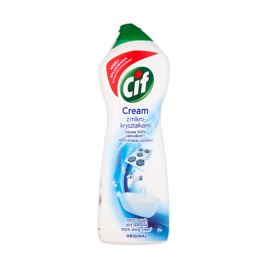 Jego formuła usuwa w 100%* domowe zabrudzenia, by oferować nawet 100%* idealnie czystych powierzchni. Dzięki wzbogaceniu mikro-kryształkami, mleczko Cif wnika w głąb plam, skutecznie je usuwać i gwarantować efekt perfekcyjnej, lśniącej czystości.