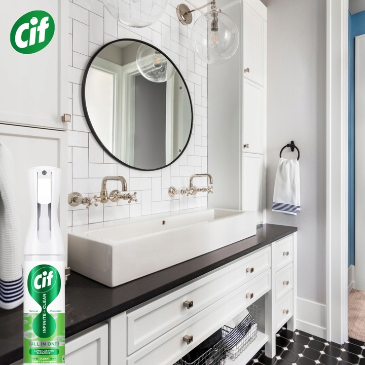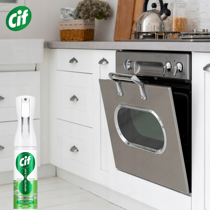 Formuła sprayu Cif Infinite Clean z naturalnymi probiotykami zapewni w Twoim domu długotrwałą czystość z efektem działania nawet do 3 dni*.WYGODNE I SZYBKIE SPRZĄTANIE