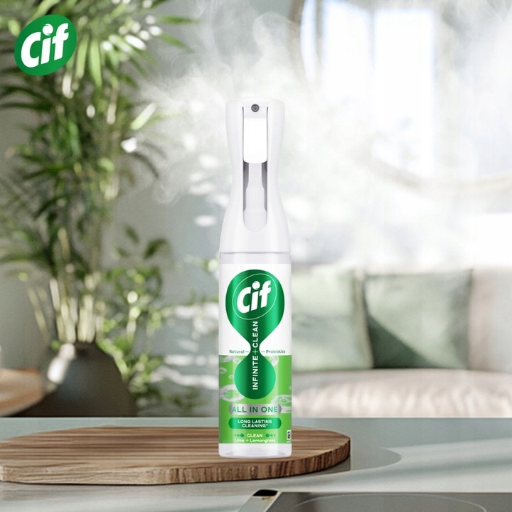 Cif Infinite Clean Uniwersalny Spray Lime + Lemongrass – Twoje codzienne sprzątanie na nowym poziomie! Poznaj innowacyjny środek czyszczący, który łączy skuteczność tradycyjnych detergentów z dobroczynnym działaniem naturalnych probiotyków. Idealny do codziennego czyszczenia różnego rodzaju powierzchni, zapewnia higieniczną czystość i świeżość w Twoim domu. Wszechstronne zastosowanie uniwersalnego sprayu Cif sprawdzi się wszędzie – w kuchni, łazience, a nawet na zewnątrz!Doskonale czyści: