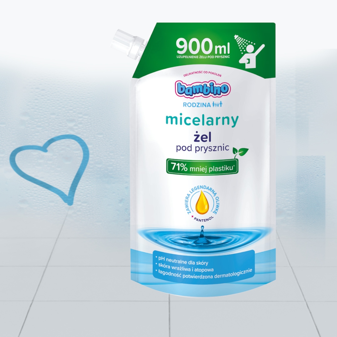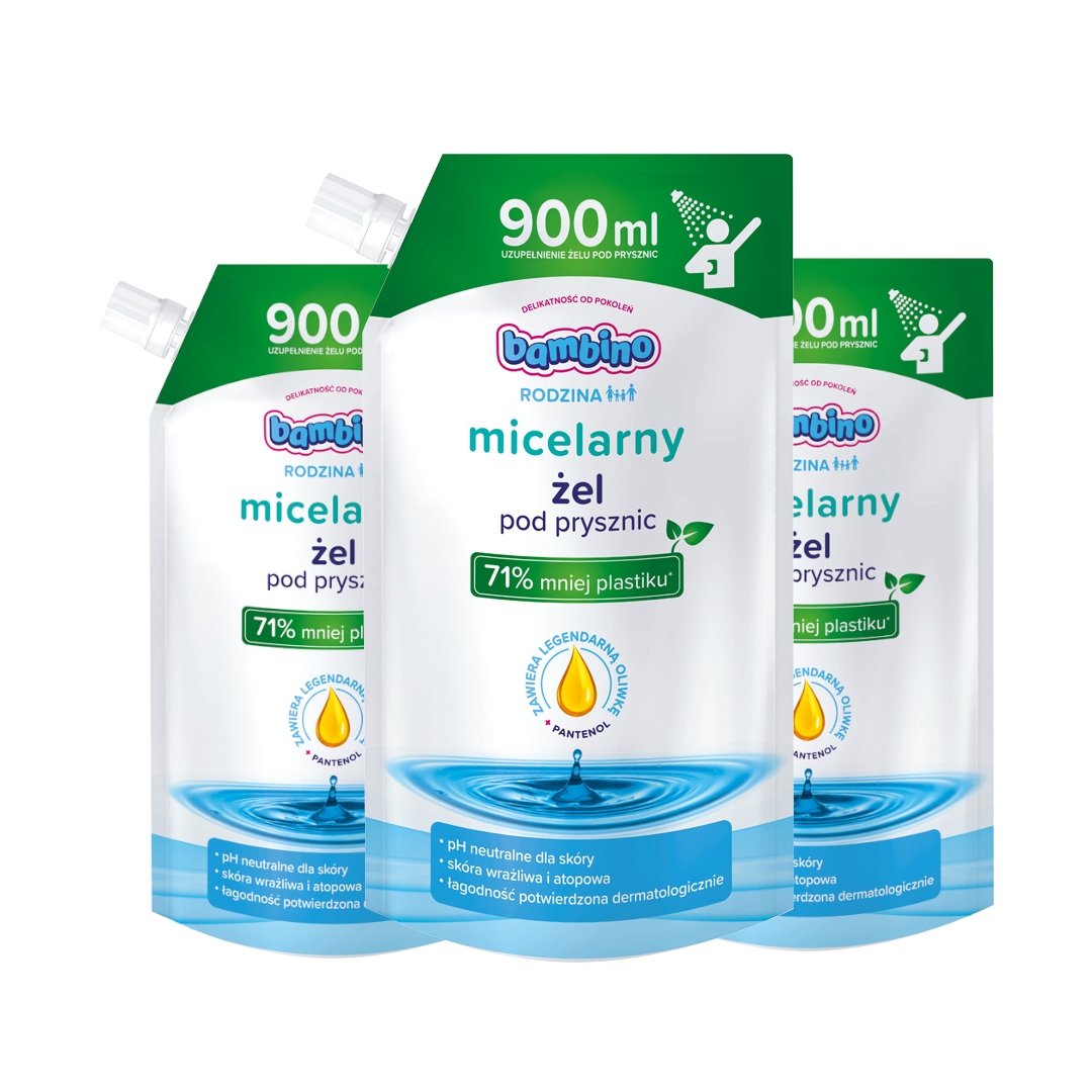 Stworzyliśmy kosmetyki BAMBINO RODZINA z myślą o wszystkich członkach rodziny: rodzicach i dzieciach. Delikatny skład, duże opakowania, wygodne pompki – to wszystko ułatwi i uprzyjemni codzienne kąpiele. W każdym produkcie z linii BAMBINO RODZINA znajduje się kropla czułości – legendarnej oliwki Bambino. Bo czułość w rodzinie to podstawa.Żel pod prysznic Bambino RODZINA utrzymuje prawidłowe nawilżenie skóry i pomaga zapobiegać podrażnieniom. Delikatna, lekka formuła skutecznie oczyszcza skórę i pozostawia uczucie świeżości oraz subtelny zapach. Jest idealny do codziennej pielęgnacji różnego typu skóry, w tym skłonnej do podrażnień. Eko-uzupełnienie micelarnego żelu pod prysznic daje gwarancję, że Twojego ulubionego produktu do kąpieli nigdy nie zabraknie.Teraz cała rodzina jeszcze dłużej może cieszyć się hiperdelikatną pielęgnacją!Opakowanie zawiera 71% mniej plastiku w porównaniu do standardowej butelki Bambino 1000 ml w przeliczeniu na ml.- chroni skórę przed wysuszeniem i uczuciem napięcia,