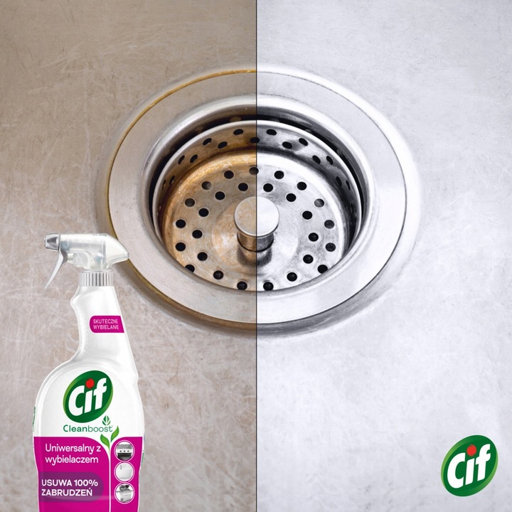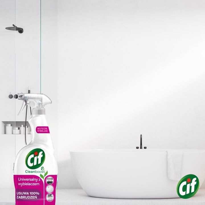 Cif Cleanboost Uniwersalny z wybielaczem skutecznie usuwa 100% brudu oraz osadu i sprawia, że jasne powierzchnie w łazience i kuchni stają się lśniąco czyste.