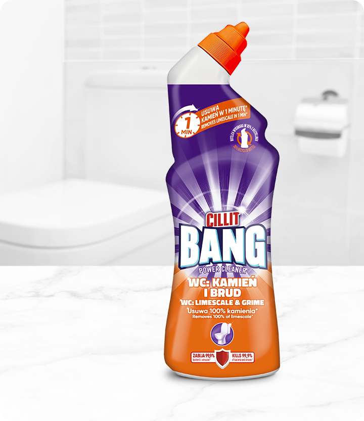 Z Cillit Bang WC Kamień i Brud skutecznie i szybko wyczyść oraz zdezynfekuj swoją toaletę. Nasz aktywny żel usuwa 100% kamienia* nawet w głębi toalety i rozpuszcza najbardziej uporczywe zabrudzenia (rdzę, plamy z moczu). Jego skuteczna formuła pozwala mu być aktywnym w każdym zakamarku Twojej toalety: zarówno pod powierzchnią wody, jak i przy krawędzi muszli oraz pozwala usunąć 99,9% bakterii i wirusów*, zapewniając czyste i higieniczne środowisko.