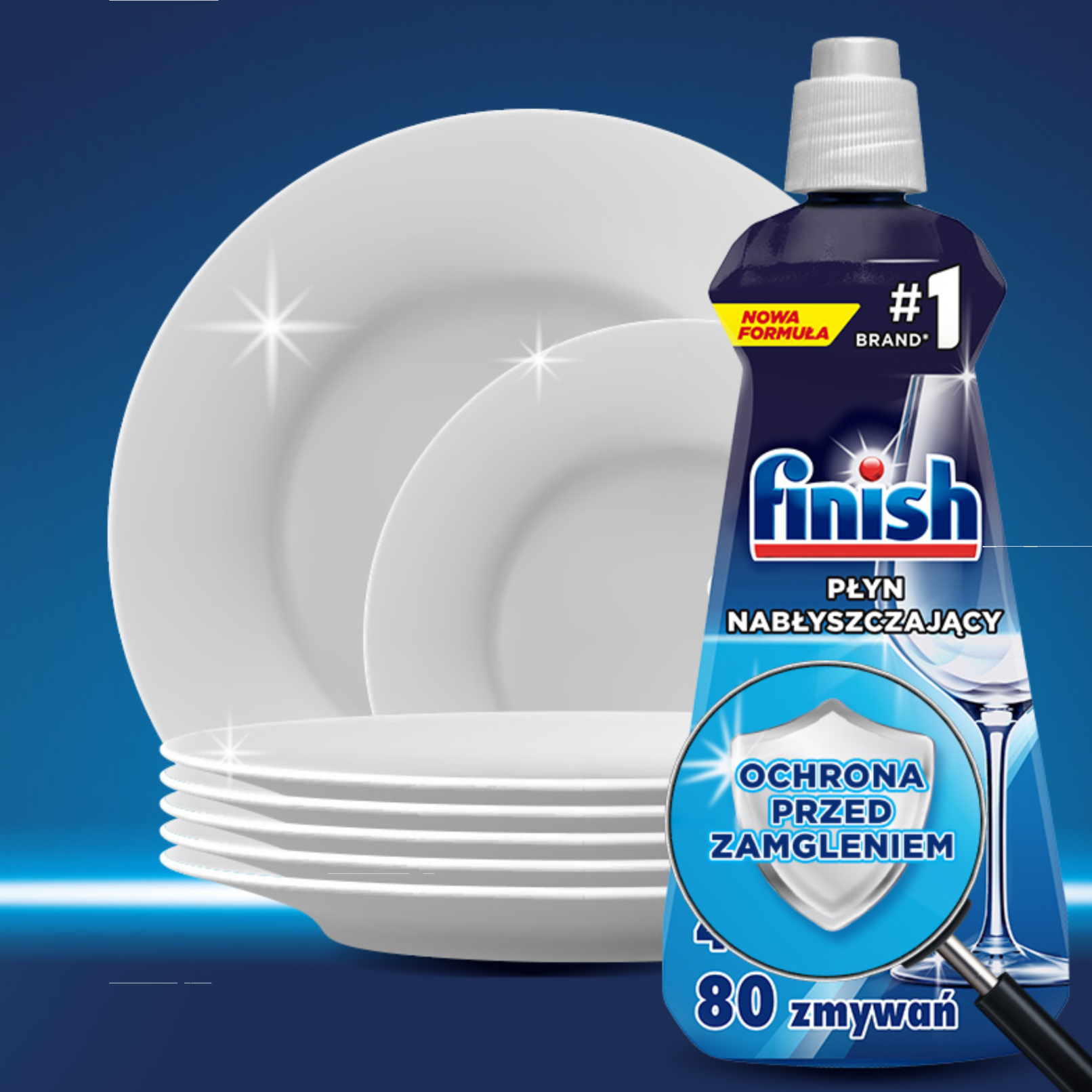 Finish płyn nabłyszczający zapewnia 100% lepsze efekty schnięcia* oraz zapobiega powstawaniu zacieków na Twoich naczyniach i szkle. Jego formuła o wzmocnionych właściwościach ochronnych szkła, chroni je przed zamgleniem**, zapewniając długotrwały olśniewający blask.