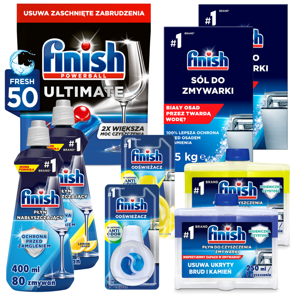 Finish Giga Zestaw do Zmywarki 8 produktów + Kapsułki Ultimate 50 Sztuk