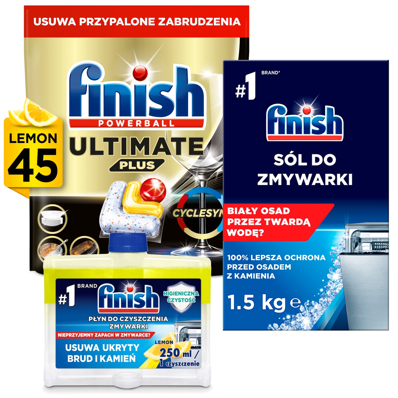 Finish Zestaw Lemon do Zmywarki Kapsułki 45 Sztuk, Sól 1.5kg, Czyścik 250ml