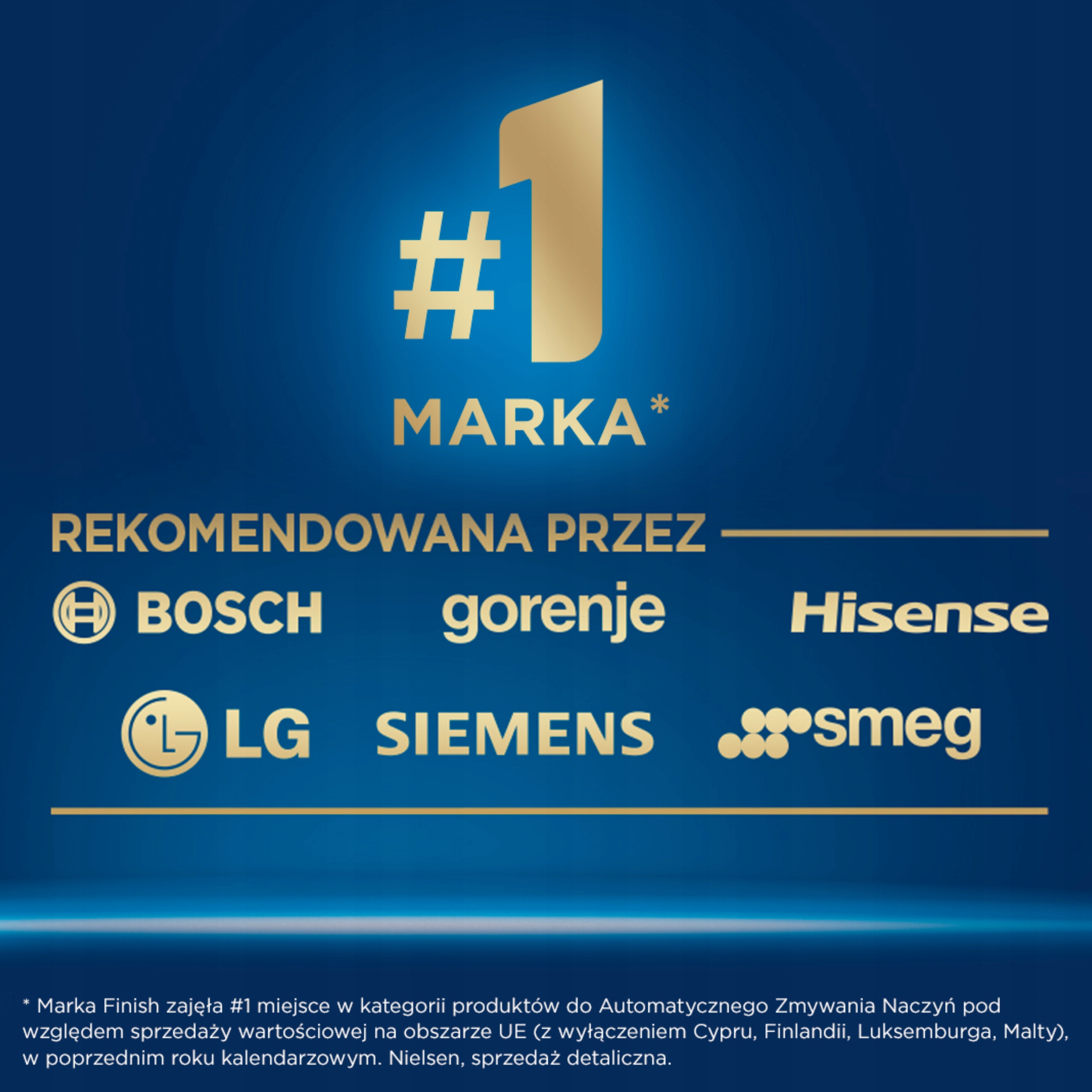 Finish to marka numer 1, rekomendowana przez producentów zmywarek takich jak: Bosch, Gorenje, Hisense, LG, Siemens, Smeg. Marka Finish już od wynalezienia zmywarki przewodzi innowacjom, które wyznaczają diamentowy standard w kategorii produktów do zmywania w zmywarce.Opakowanie po zmianie