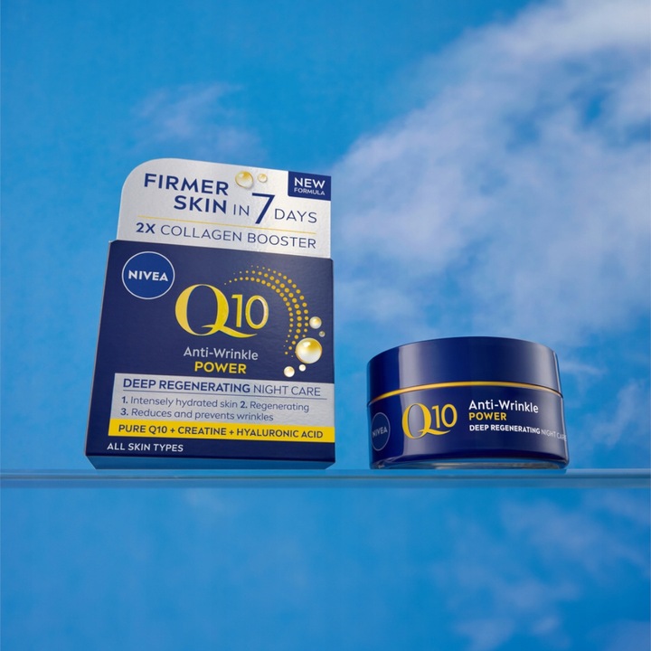 NIVEA Q10 UJĘDRNIENIE Przeciwzmarszczkowy Nawilżający krem na noc zawiera najczystszy, w 100% identyczny jak w skórze Koenzym Q10 i Kreatynę. Zapewnia podwójne działanie przeciwzmarszczkowe. Bogata konsystencja łatwo rozprowadza się na skórze, intensywnie pielęgnuje i nawilża, zapewniając uczucie gładkości i miękkości skóry, a także redukuje zmarszczki i zapobiega powstawaniu nowych. Tolerancja dla skóry została potwierdzona dermatologicznie. Dla wszystkich typów skóry. Potwierdzone klinicznie rezultaty: 7 dni: redukcja zmarszczek u 86% kobiet**; 7 dni: bardziej jędrna skóra u 76% kobiet**; 2 tygodnie: intensywnie nawilżona skóra u 90% kobiet***; 4 tygodnie: zregenerowana skóra u 73% kobiet***. ** Samoocena, 42 kobiety, 2021, ***Badania aparaturowe: nawilżenie, regeneracja, 30 kobiet, 2021.