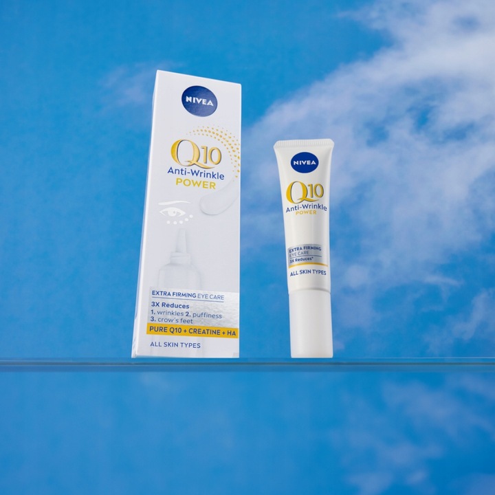 NIVEA Q10 UJĘDRNIENIE Przeciwzmarszczkowy krem pod oczy to formuła opracowana specjalnie dla delikatnej skóry wokół oczu: widocznie redukuje zmarszczki i linie o 17%**, zauważalnie ujędrnia, widocznie zmniejsza cienie pod oczami o 33%**, redukuje opuchliznę wokół oczu. Formuła wzbogacona najczystszym, w 100% identycznym jak w skórze Koenzymem Q10 i Kreatyną. Chroni komórki skóry przed negatywnym wpływem wolnych rodników*. Dodaje skórze energii pomagając jej w procesie regeneracji*. Dzięki Kreatynie wzmacnia włókna ujędrniające skórę*. Produkt przebadany dermatologicznie I okulistycznie. Odpowiedni także dla osób noszących szkła kontaktowe. *badanie in-vitro ** 2 tyg. Badanie z udziałem 31 kobiet, 2019