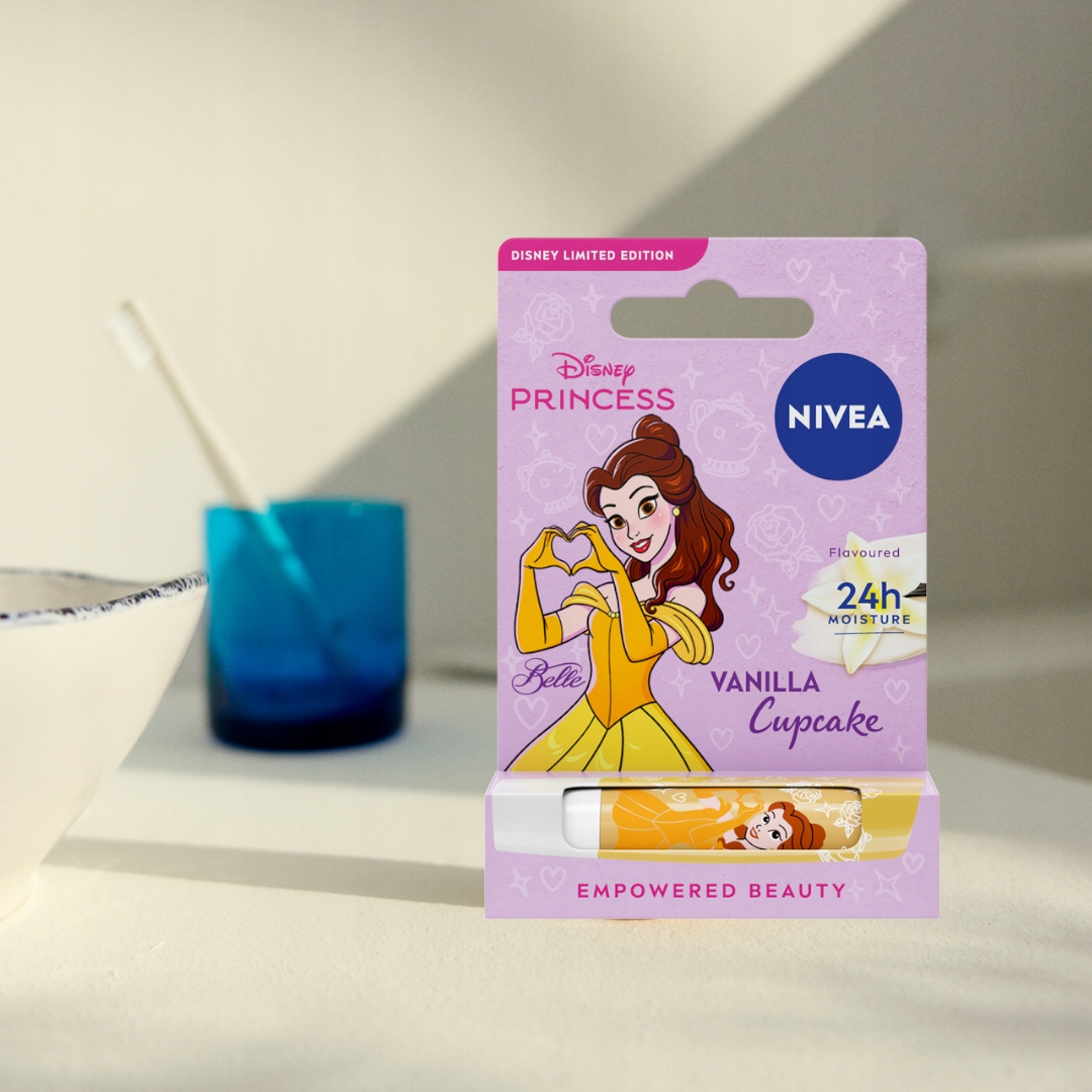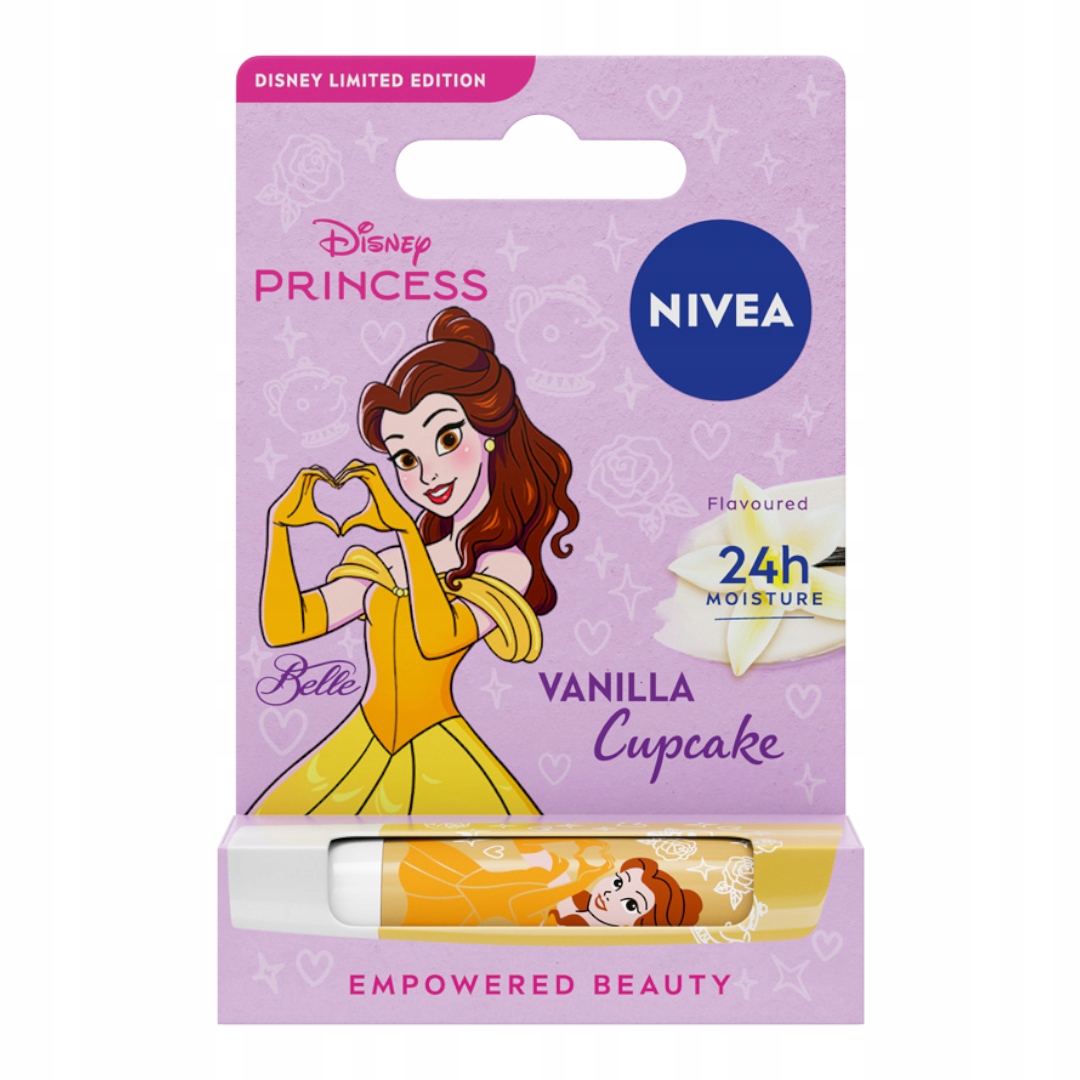 Odkryj pielęgnującą pomadkę do ust NIVEA Vanilla Cupcake Bella z Limitowanej Edycji Disney Princess, która zapewnia słodki aromat wanilii i subtelny połysk. Unikalna formuła zawierająca wyłącznie składniki pochodzenia naturalnego bez składników pochodzenia zwierzęcego, takich jak etycznie pozyskiwane masło shea, olejki i witaminy, wtapia się w usta i utrzymuje ich nawilżenie przez ponad 24 godziny. Chroni usta przed zimnem, wiatrem i suchym powietrzem. Równomiernie i łatwo się rozprowadza, dzięki czemu nie wymaga korzystania z lusterka! Dla pięknego dotyku błyszczącego koloru i miękkich, całuśnych ust - przez cały dzień, każdego dnia! Tolerancja dla skóry potwierdzona dermatologicznie - testowana klinicznie! NIVEA® - ponad 100 lat doświadczenia w pielęgnacji skóry oraz starannie wyselekcjonowane składniki z zachowaniem najwyższych standardów jakości.