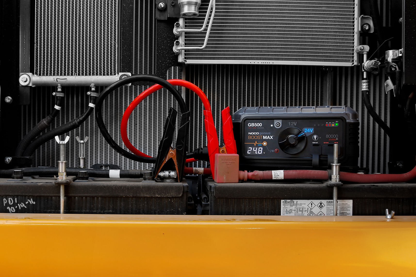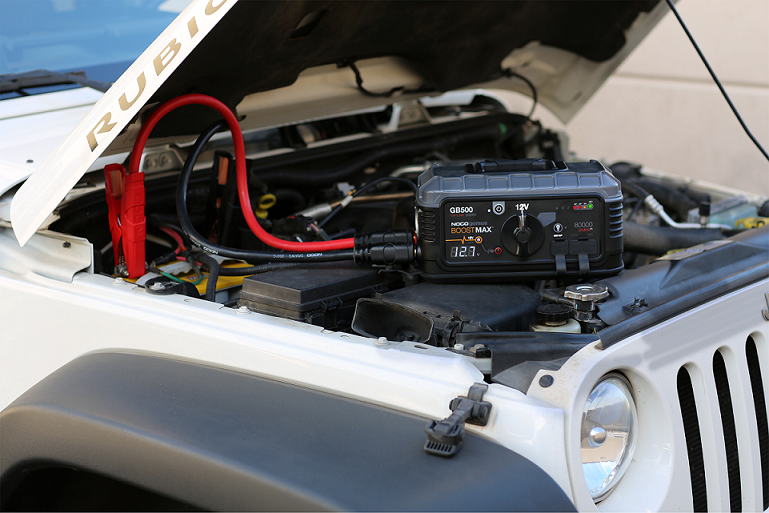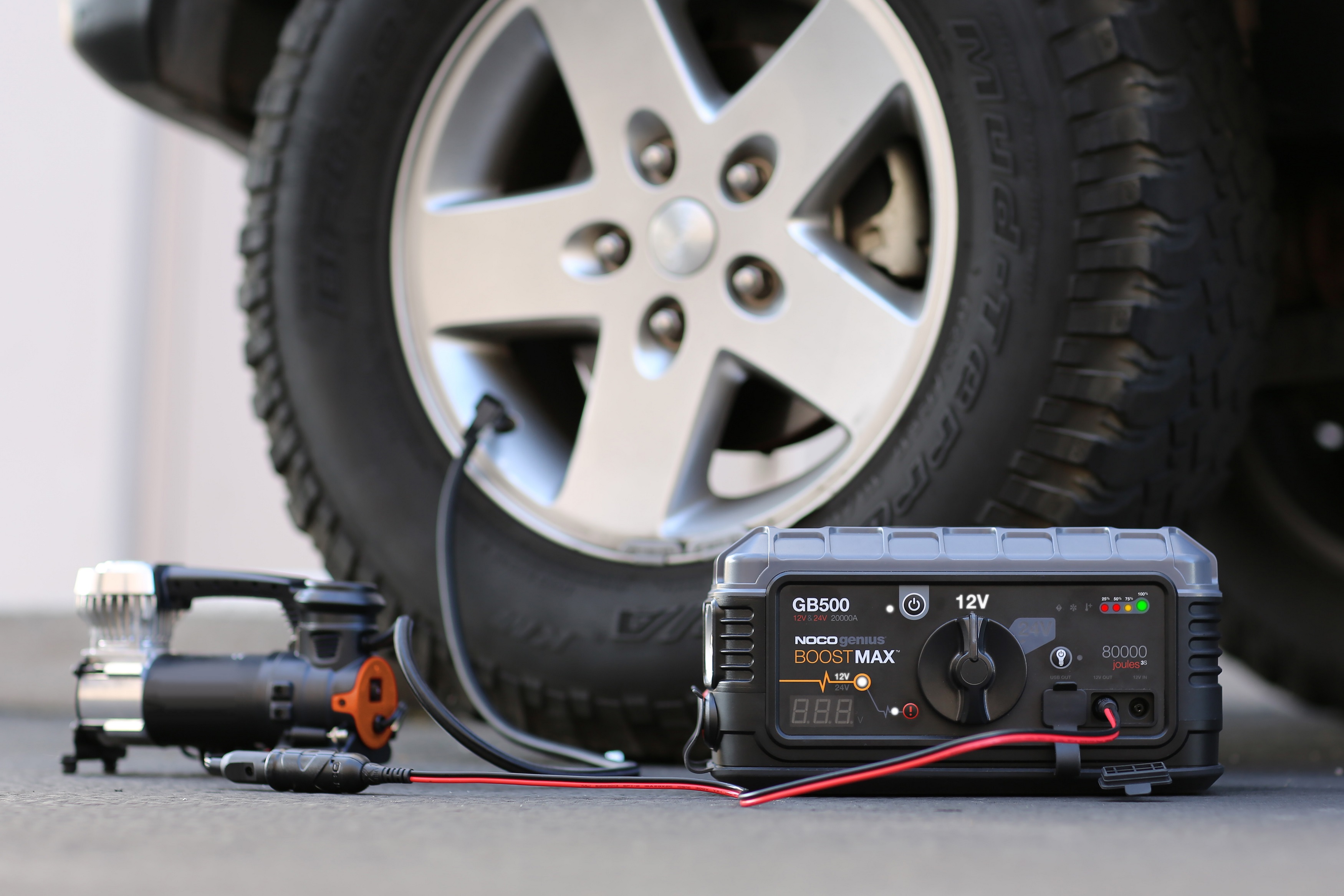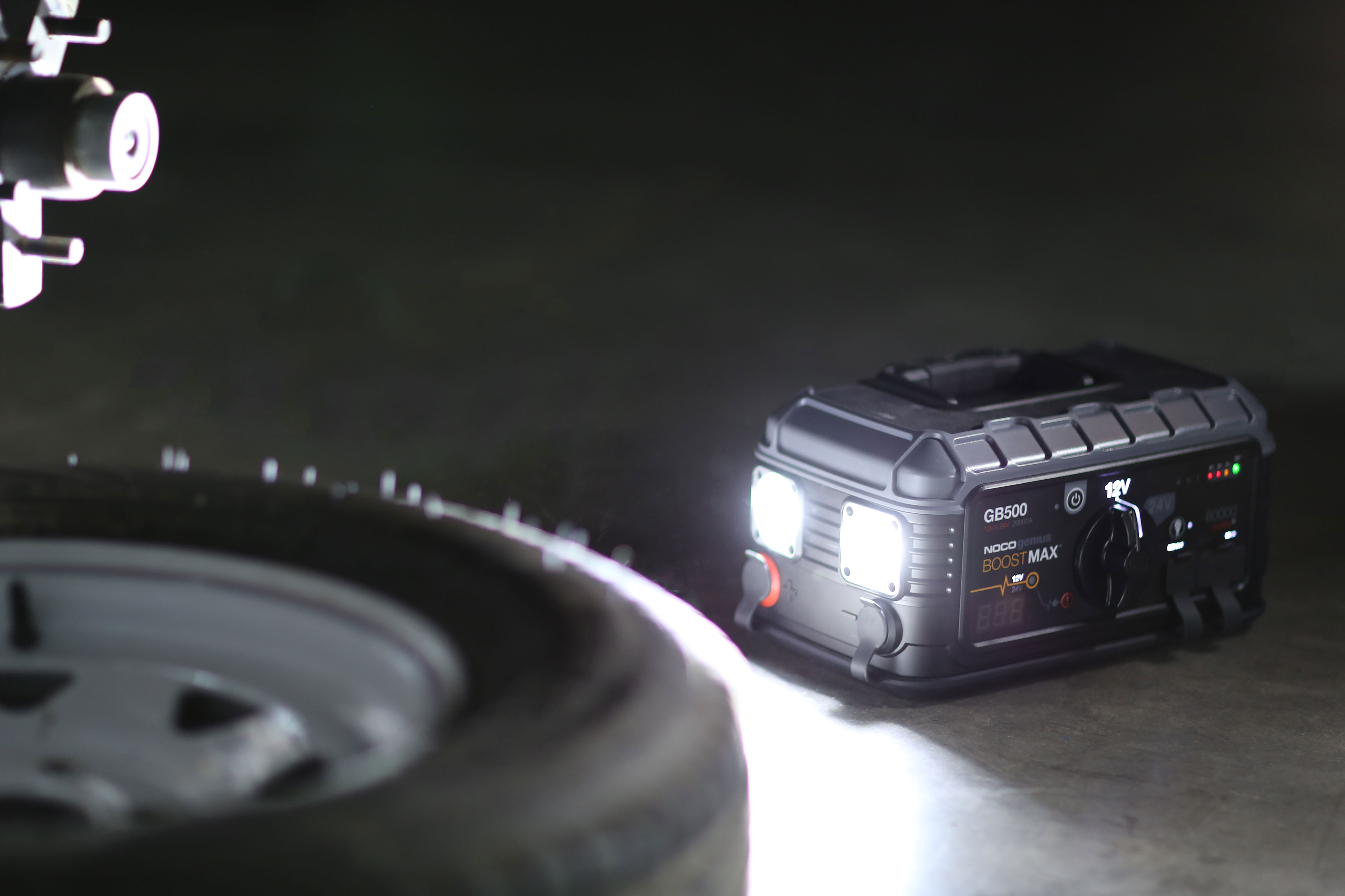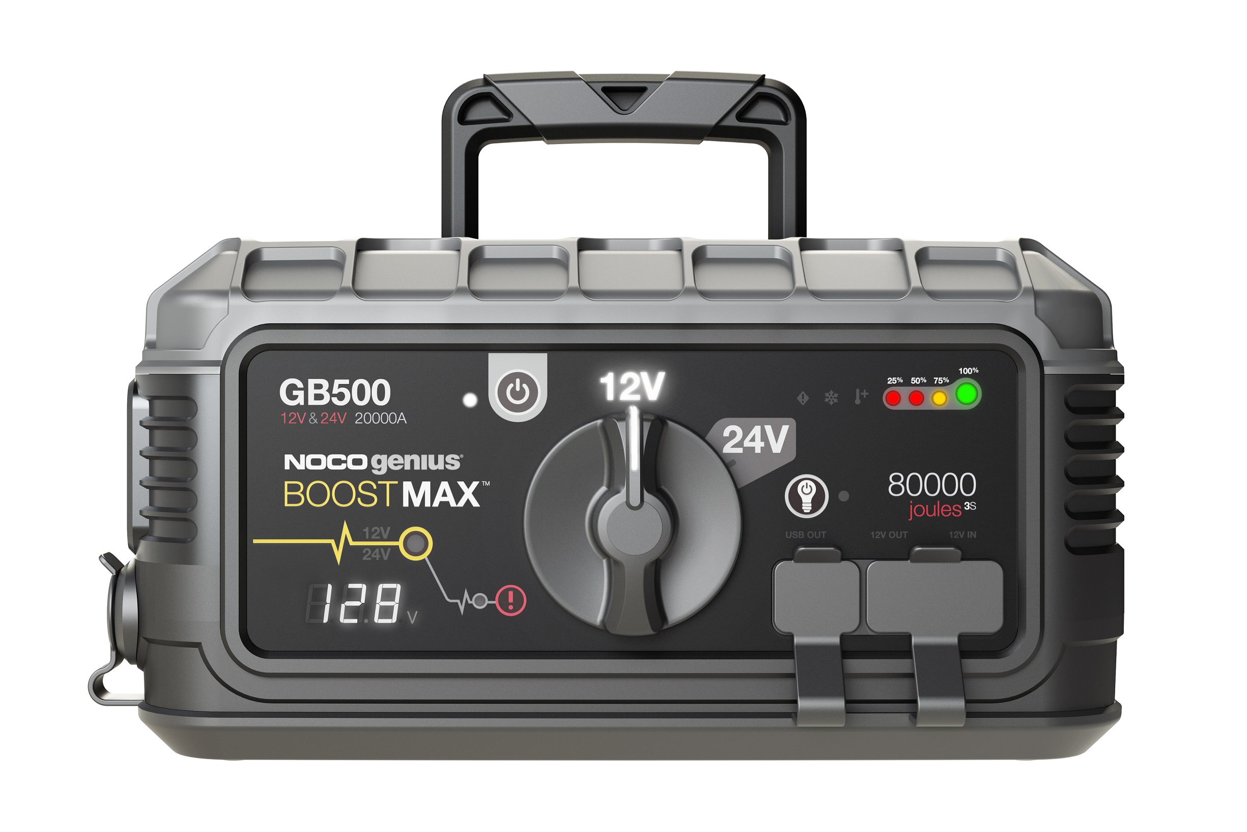NOCO GB500 - urządzenie rozruchowe 12V /24V, wyjątkowo bezpieczne kompaktowe, litowo-jonowe o prądzie rozruchowym 20 000A, 80 000 Dżuli3S (10000 A, 40 000 Dżuli3S przy 24 V). Przeznaczony do silników benzynowych i dieseli 12V i 24V w pojazdach o wysokiej pojemności, klasy 8 + / CE. (ciężarówki, ciężki sprzęt i inne). Wydajność- do 400 rozruchów na jednym naładowaniu. Posiada wbudowany voltomierz. Boost Max jest o 400 procent mniejszy i lżejszy niż jego najbliższy odpowiednik kwasowo-ołowiowy. Posiada opatentowaną ochronę przed iskrzeniem i odwrotną polaryzacją, a także pewność zasilania ulubionych urządzeń, od smartfonów po kompresory do opon. Reflektor LED o wysokim strumieniu świetlnym 2200 lumenów z 7 trybami świecenia, w tym SOS i stroboskopowe awaryjne. Podwójne porty USB do ładowania wielu urządzeń, takich jak smartfony, tablety i nie tylko. Zaprojektowane w USA.Zawartość opakowania: