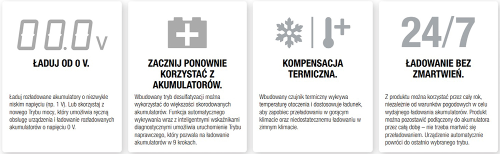 - W pełni automatyczna ładowarka i urządzenie podtrzymujące ładowanie do codziennego użytkowania 24/7 bez zmartwienia o przeładowanie
