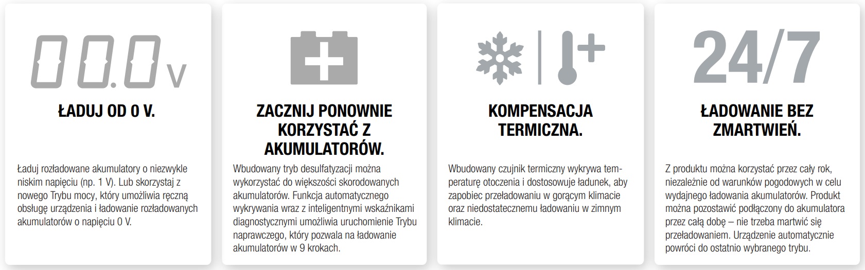 - W pełni automatyczna ładowarka i urządzenie podtrzymujące ładowanie do codziennego użytkowania 24/7 bez zmartwienia o przeładowanie
