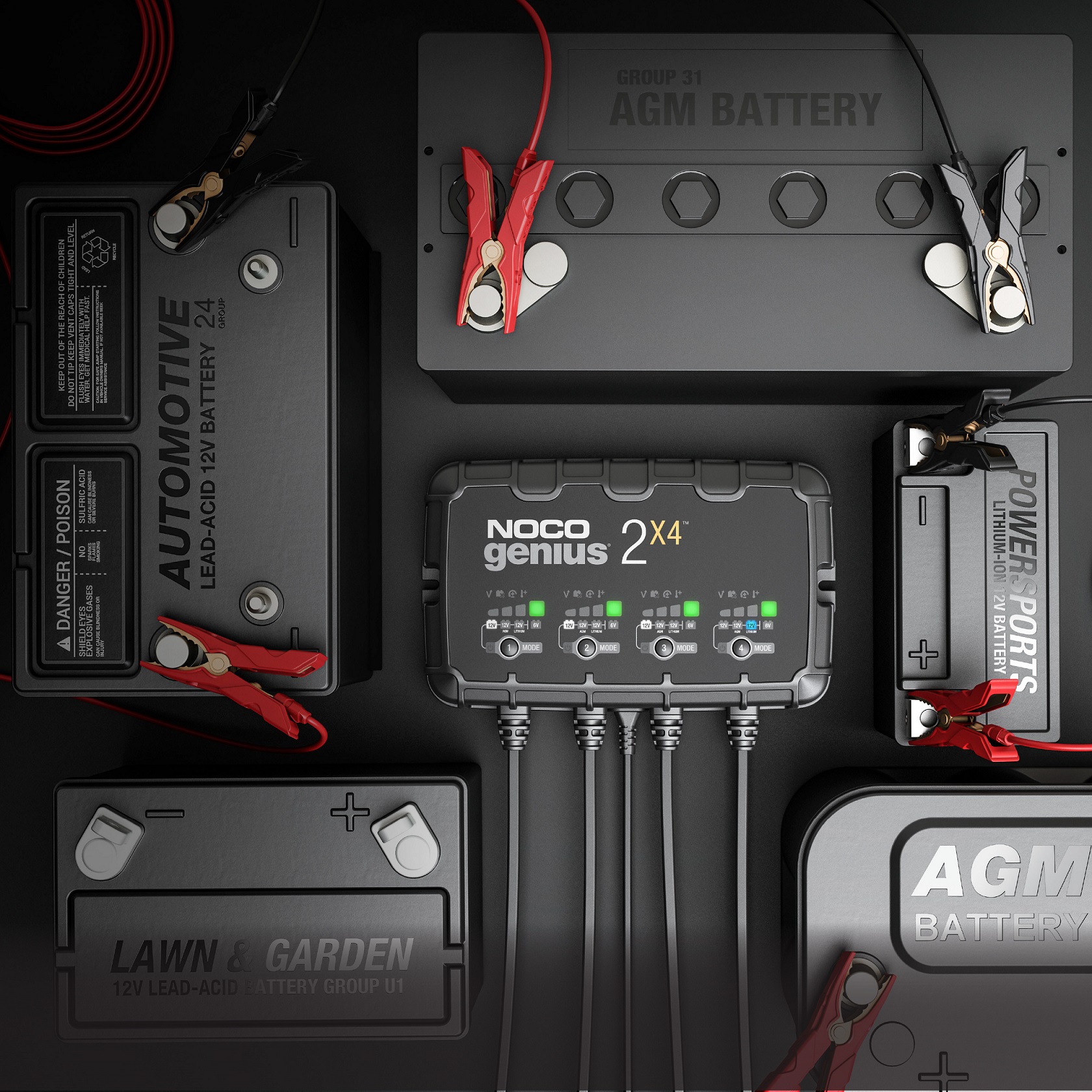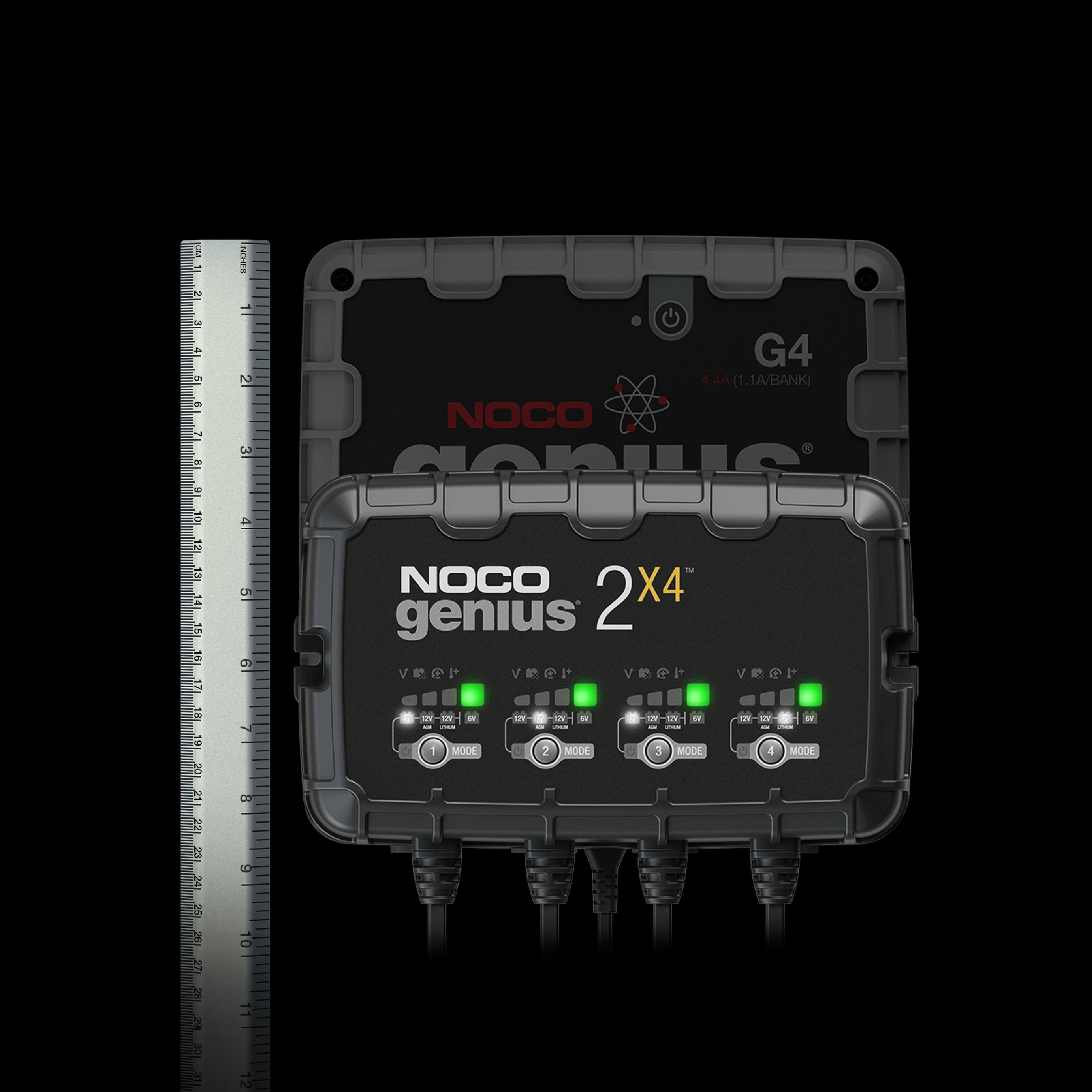NOCO GENIUS2X4, 4 urządzenia (4-ładowarki w jednej obudowie, mogące ładować jednocześnie 4 akumulatory), 8-amperowa (2A na każdą ładowarkę). W pełni automatyczna inteligentna ładowarka, ładowarka 6 V i 12 V, urządzenie podtrzymujące ładowanie akumulatora i odsiarczacz akumulatora z kompensacją temperatury. To kompleksowe rozwiązanie 4-bankowe (cztery ładowarki w jednej obudowie) - ładowarka, konserwator, ładowarka podtrzymująca ładowanie oraz odsiarczacz.