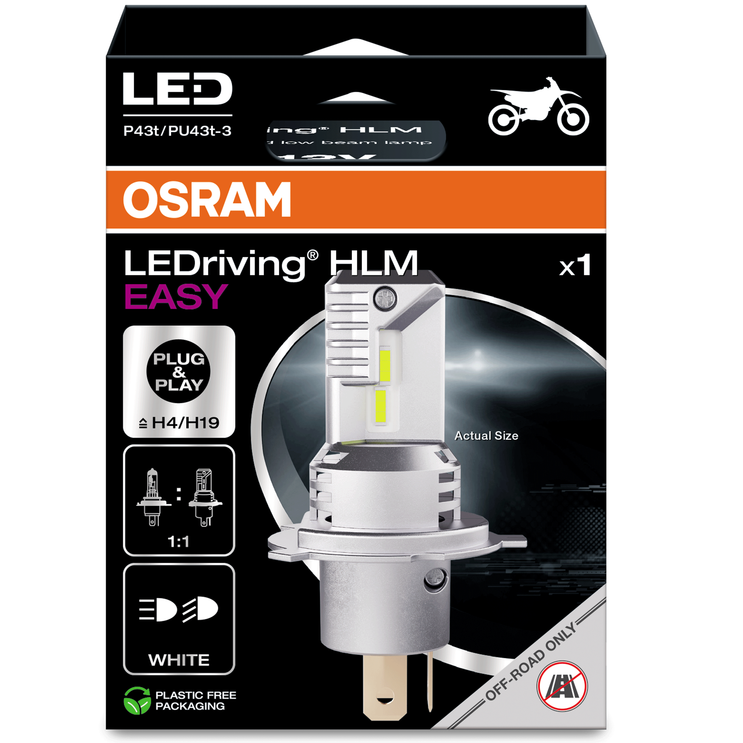 Lampy LED do świateł drogowych i mijania z systemem plug&play do motocykli. Dzięki rozwiązaniu opartemu na gniazdach, moduły modernizacyjne OSRAM LEDriving HLM EASY zapewniają ultrakompaktowy zamiennik LED konwencjonalnych lamp drogowych i mijania H4/H19 na chłodne białe światło LED – zapewniając stylowy wygląd i doskonałą jasność. Oferuje łatwą instalację typu plug & play i zoptymalizowaną kompatybilność. Zoptymalizowany, szybki wentylator zapewnia aktywne chłodzenie, dzięki czemu możliwa jest wyższa wydajność i wysoki poziom strumienia świetlnego dzięki maksymalnemu rozpraszaniu ciepła.Temperatura barwowa chłodnej bieli