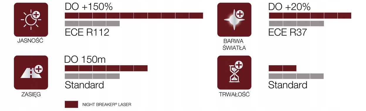 Najbardziej wydajne żarówki halogenowe firmy OSRAMOdkryj nową generację NIGHT BREAKER LASER - najjaśniejszych samochodowych żarówek halogenowych OSRAM! Dzięki zastosowaniu innowacyjnej technologii ablacji laserowej świecą do 150% jaśniej w porównaniu do minimalnych wymogów homologacyjnych. Precyzyjnie wykonany i umiejscowiony żarnik zapewnia dodatkową ilość światła. Dzięki temu żarówki oświetlają drogę do 150 metrów przed pojazdem. Dodatkowo wytwarzają do 20% bielsze światło w porównaniu z minimalnymi wymaganiami normy. Więcej światła i lepsza widoczność mogą pomóc kierowcom w szybszym identyfikowaniu i reagowaniu na zagrożenia drogowe. OSRAM NIGHT BREAKER LASER to także unikalne wzornictwo dzięki nazwie produktu wypisanej laserowo na bańce.- Do 150% jaśniejsze światło
