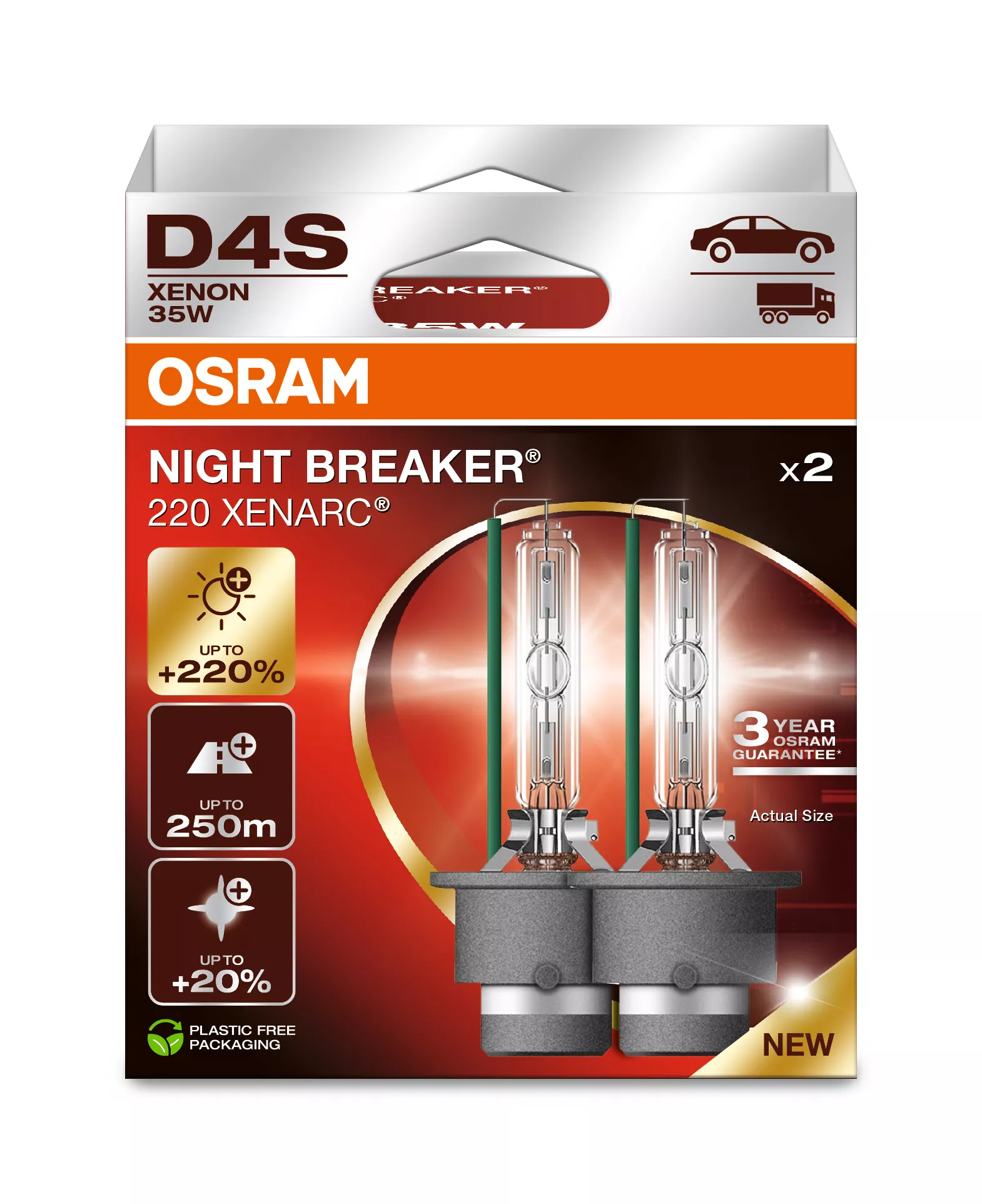 Najsilniejsze światło ksenonowe OSRAM XENARC NIGHT BREAKER 220 to najjaśniejsze światło ksenonowe firmy OSRAM. Te wyjątkowo jasne ksenony zapewniają znacznie lepszą widoczność na drodze: aż do 220% jaśniejsze światło w porównaniu do minimalnych wymagań normy.