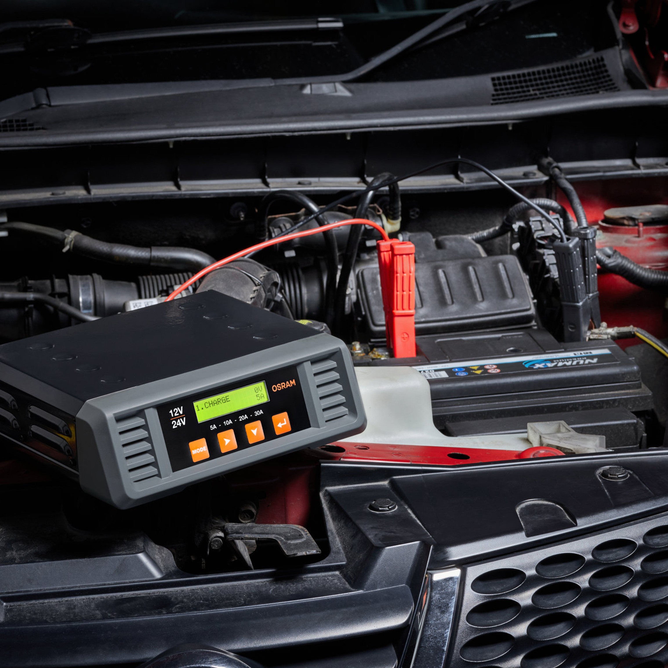 Opracowany przez profesjonalistów – stworzony dla profesjonalistówOSRAM BATTERYcharge PRO 30A to profesjonalna, inteligentna ładowarka odpowiednia dla szerokiej gamy typów akumulatorów do pojazdów 12V i 24V. Idealny do stosowania w przypadku konieczności konserwacji różnych pojazdów, a nawet całych flot, zwłaszcza w profesjonalnych warsztatach lub salonach wystawowych.Wybierając różne typy akumulatorów i poziomy ładowania, użytkownik może ustawić określone ładowanie wymagane dla różnych typów akumulatorów. BATTERYcharge PRO 30A może dostarczać zmienne prądy ładowania do maksymalnie 30A. Jest to możliwe zarówno w przypadku akumulatorów kwasowo-ołowiowych, jak i litowych (AGM, GEL, STD, EFB, LFP, LiFePO4) oraz akumulatorów start/stop.Zmienne szybkości ładowania 5A/10A/20A/30A mogą również zapewnić elastyczne wolne lub szybkie ładowanie, aby spełnić indywidualne wymagania każdego użytkownika. Zintegrowana funkcja testowa dodatkowo umożliwia diagnostykę akumulatora i alternatora. Profesjonalna ładowarka firmy OSRAM ze zintegrowanym ekranem LCD wykonuje 8-etapowy cykl ładowania dla akumulatorów litowych i 9-etapowy cykl ładowania dla wszystkich innych akumulatorów, aby przywrócić i zoptymalizować wydajność akumulatorów oraz poprawić utrzymanie ładunku. Dzięki niewielkiej wadze profesjonalna ładowarka firmy OSRAM jest łatwa do przenoszenia i transportu w warsztacie.