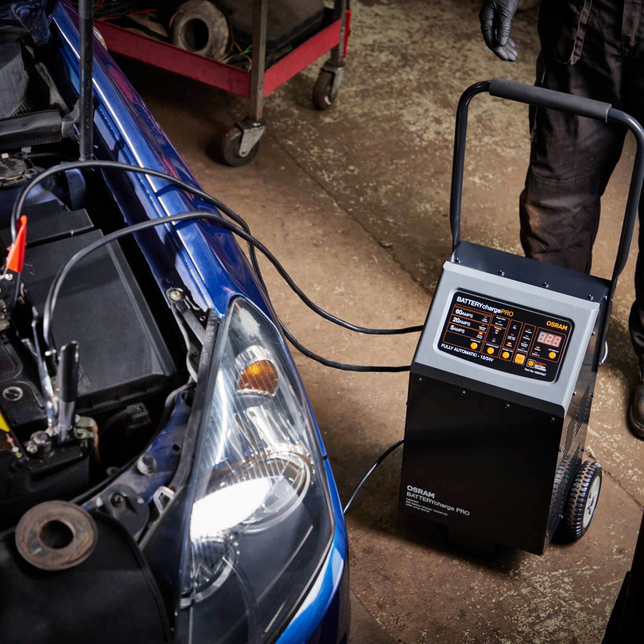 Oprócz funkcji ładowania akumulatora BATTERYcharge PRO 60A posiada zintegrowaną funkcję rozruchu awaryjnego. Profesjonalna ładowarka firmy OSRAM ze zintegrowanym ekranem LCD wykonuje 7-etapowy cykl ładowania dla akumulatorów litowych i 3-etapowy cykl ładowania dla wszystkich innych akumulatorów, aby przywrócić i zoptymalizować wydajność akumulatorów oraz poprawić utrzymanie ładunku. Wyposażona w uchwyt do wygodnego przenoszenia na górze urządzenia i kółka ułatwiające ciągnięcie lub pchanie, profesjonalna ładowarka firmy OSRAM jest łatwa do transportu po warsztacie.