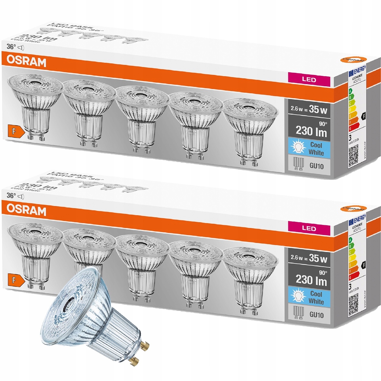 10x ŻARÓWEK LED GU10 2,6W 4000K 230lm OSRAM. Jest to źródło światła z trzonkiem GU10 o mocy 2,6W (odpowiednik klasycznej żarówki o mocy 35W). Halogen ten emituje zimną barwę światła 4000K o strumieniu świetlnym 230lm. Dzięki wykorzystaniu innowacyjnej TECHNOLOGI LED żarówka marki OSRAM zapewnia nam bardzo wysoką jakość światła oraz rzeczywiste odzwierciedlenie barw. Największym atutem żarówek LED jest ich zmniejszone zużycie energii nawet o 90% względem tradycyjnych źródeł światła. Prezentowana żarówka marki OSRAM idealnie sprawdzi się do ogólnego i dekoracyjnego oświetlenia naszych domów czy mieszkań. Żarówka LED GU10 to energooszczędny zamiennik dla tradycyjnych reflektorów, a dzięki zastosowaniu takiego samego trzonka wymiana staje się banalnie prosta.Żarówki idealnie nadają się do: