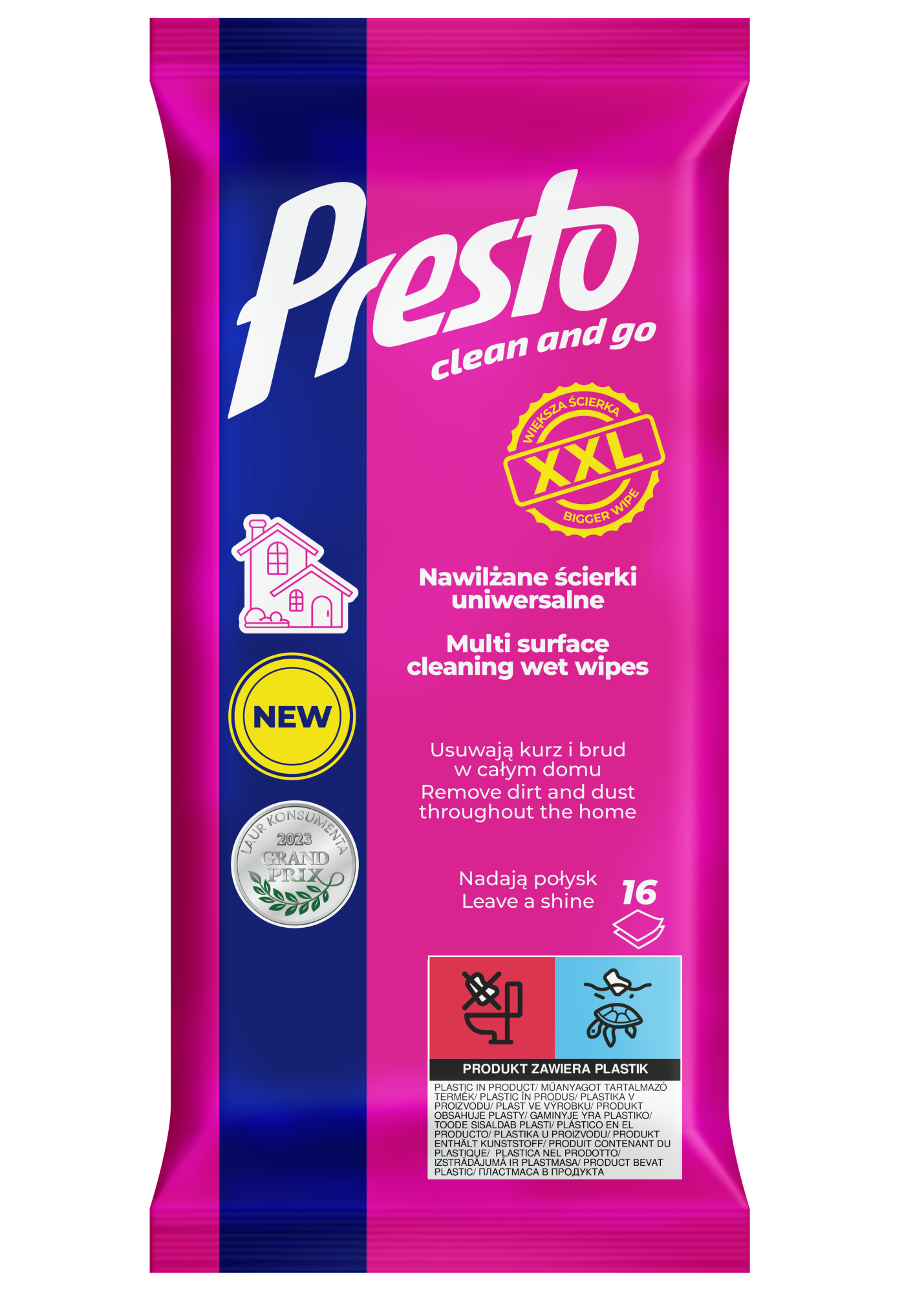 • Efekt odświeżający: Ściereczki Presto, oprócz skutecznego czyszczenia, odświeżają wnętrza i pozostawiają przyjemny, subtelny zapach, który utrzymuje się w pomieszczeniach i tworzy przyjemną atmosferę.