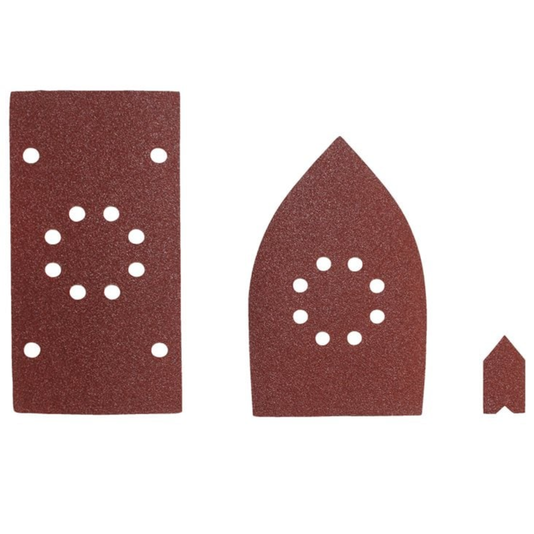 30 szt. papierów ściernych do szlifierki oscylacyjnej zawiera:10 x arkuszy ⅓ (ziarnistość: 4 x 80, 3 x 100, 3 x 120) 10 x arkuszy typu ″żelazko″ (ziarnistość: 4 x 80, 3 x 100, 3 x 120) 10 x nakładka na przednią końcówkę (ziarnistość: 4 x 80, 3 x 100, 3 x 120).