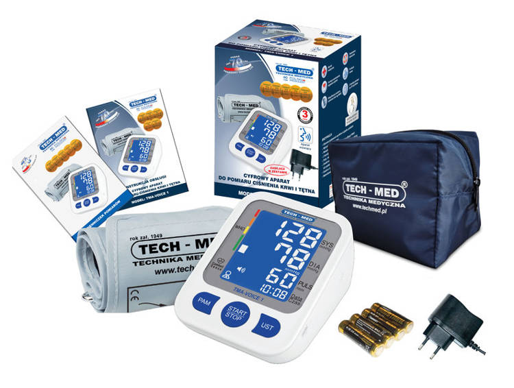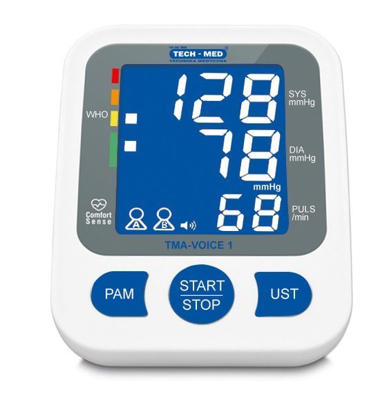TECH-MED VOICE-1 to nowoczesny ciśnieniomierz elektroniczny, w którym zastosowano oscylometryczną metodę pomiaru. Ciśnieniomierz charakteryzuje się wysoką dokładnością pomiaru – równorzędną dokładności pomiarów dokonywanych metodą osłuchową za pomocą sphygmomanometrów mechanicznych (ciśnieniomierzy lekarskich) przez wykwalifikowany personel medyczny. Dokładność ta została potwierdzona badaniami klinicznymi.Wykonanie dokładnego pomiaru ciśnienia jest niezwykle proste – wymaga przyciśnięcia tylko jednego przycisku. Duży ergonomiczny wyświetlacz LCD zapewnia łatwy odczyt wyniku pomiaru.