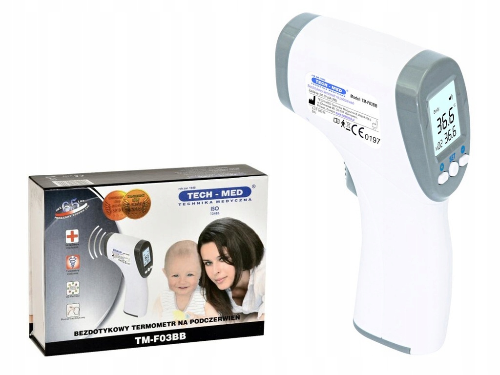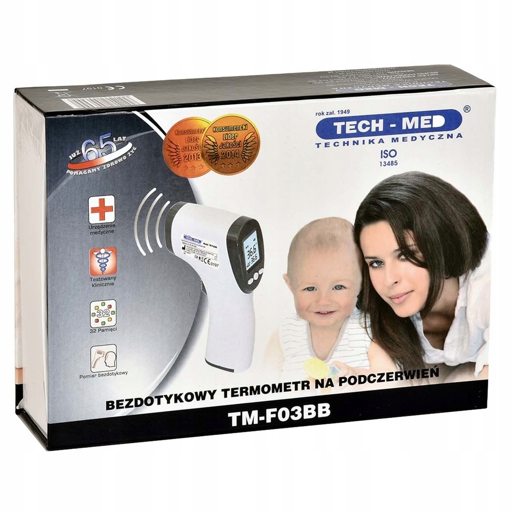 Termometr bezdotykowy Tech-Med F03BB na podczerwień zaprojektowano do pomiaru temperatury ciała lub wybranej powierzchni przy użyciu technologii promieniowania podczerwonego. Termometr na podczerwień nie jest inwazyjny, więc jest łatwiejszy i wygodniejszy w użyciu niż tradycyjne termometry doustne, pod ramię, do odbytnicze lub douszne. Jest rzeczywiście „bezkontaktowym” termometrem. Umożliwia pomiar temperatury ciała dorosłych i dzieci bez konieczności dotykania skóry. Dzięki F03BB nie ma potrzeby wprowadzania sondy termometru do jakiejkolwiek części ciała twojego niemowlęcia. Śpiące niemowlę nie obudzi się podczas kiedy termometr będzie w użyciu ani nie odczuje żadnego dyskomfortu podczas jego użycia kiedy nie śpi.