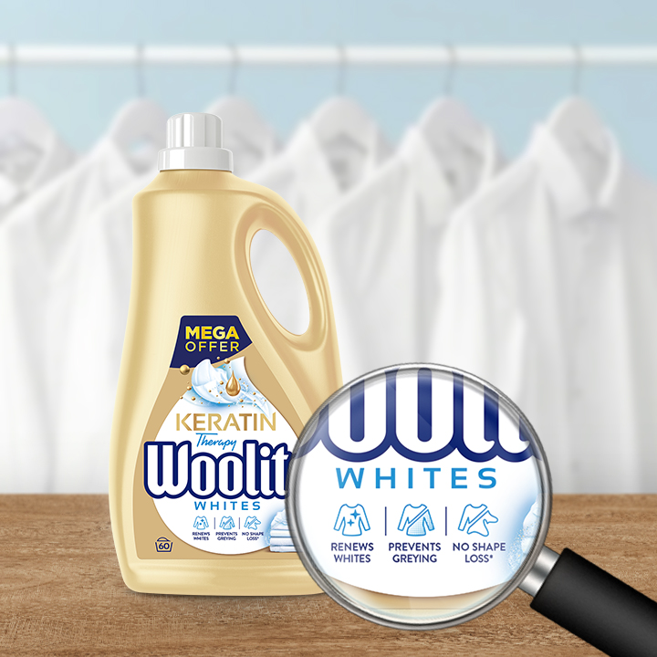 Z płynem do prania Woolite zatrzymasz blask bieli na dłużej! Nowy Woolite Keratin Therapy to płyn do codziennego prania wszystkich rodzajów ubrań, który sprawia, że Twoje jasne ubrania dłużej wyglądają nieskazitelnie.