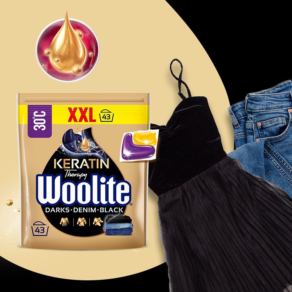 Woolite Kapsułki DoPrania Rzeczy Czarnych Ciemnych Jeans z Keratyną 43szt