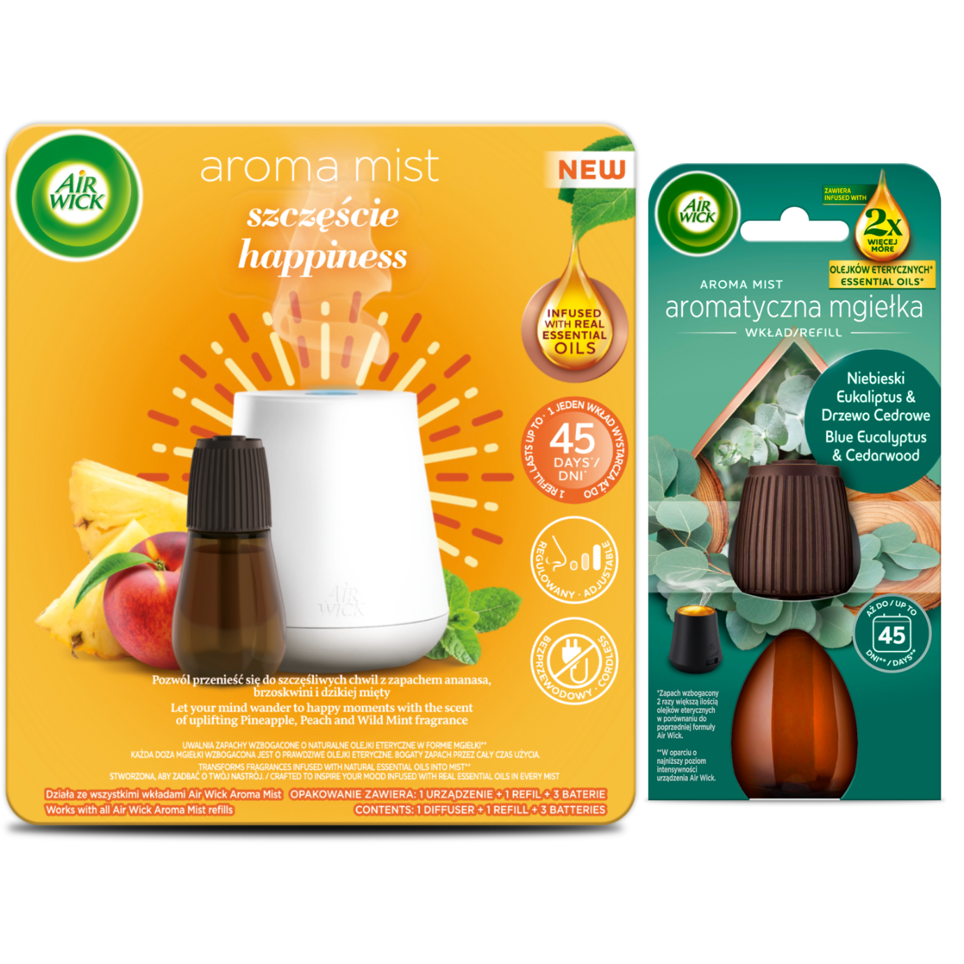 Zestaw AIR WICK Aromatyczna Mgiełka Dyfuzor Szczęście – zapach ananasa, brzoskwini i dzikiej mięty Komplet + Wkład AIR WICK AROMATYCZNA MGIEŁKA O NIEBIESKI EUKALIPTUS & DRZEWO CEDROWE WKŁAD 20ML