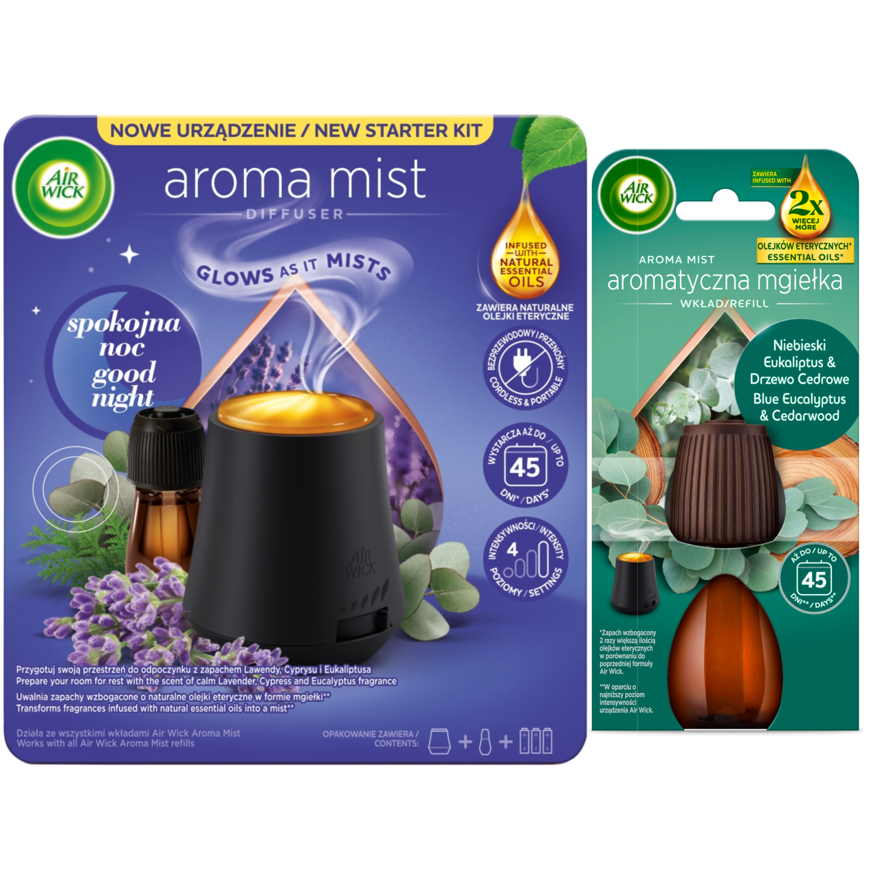 Zestaw AIR WICK Aromatyczna Mgiełka Dyfuzor Spokojna Noc Komplet + Wkład AIR WICK AROMATYCZNA MGIEŁKA O NIEBIESKI EUKALIPTUS & DRZEWO CEDROWE WKŁAD 20ML
