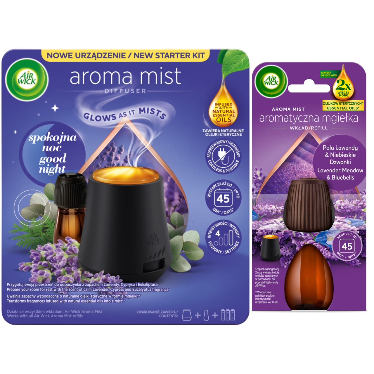 Zestaw AIR WICK Aromatyczna Mgiełka Dyfuzor Spokojna Noc Komplet + Wkład AIR WICK AROMATYCZNA MGIEŁKA O ZAPACHU ZAPACHU POLA LAWENDY & NIEBIESKIE DZWONKI WKŁAD 20ML