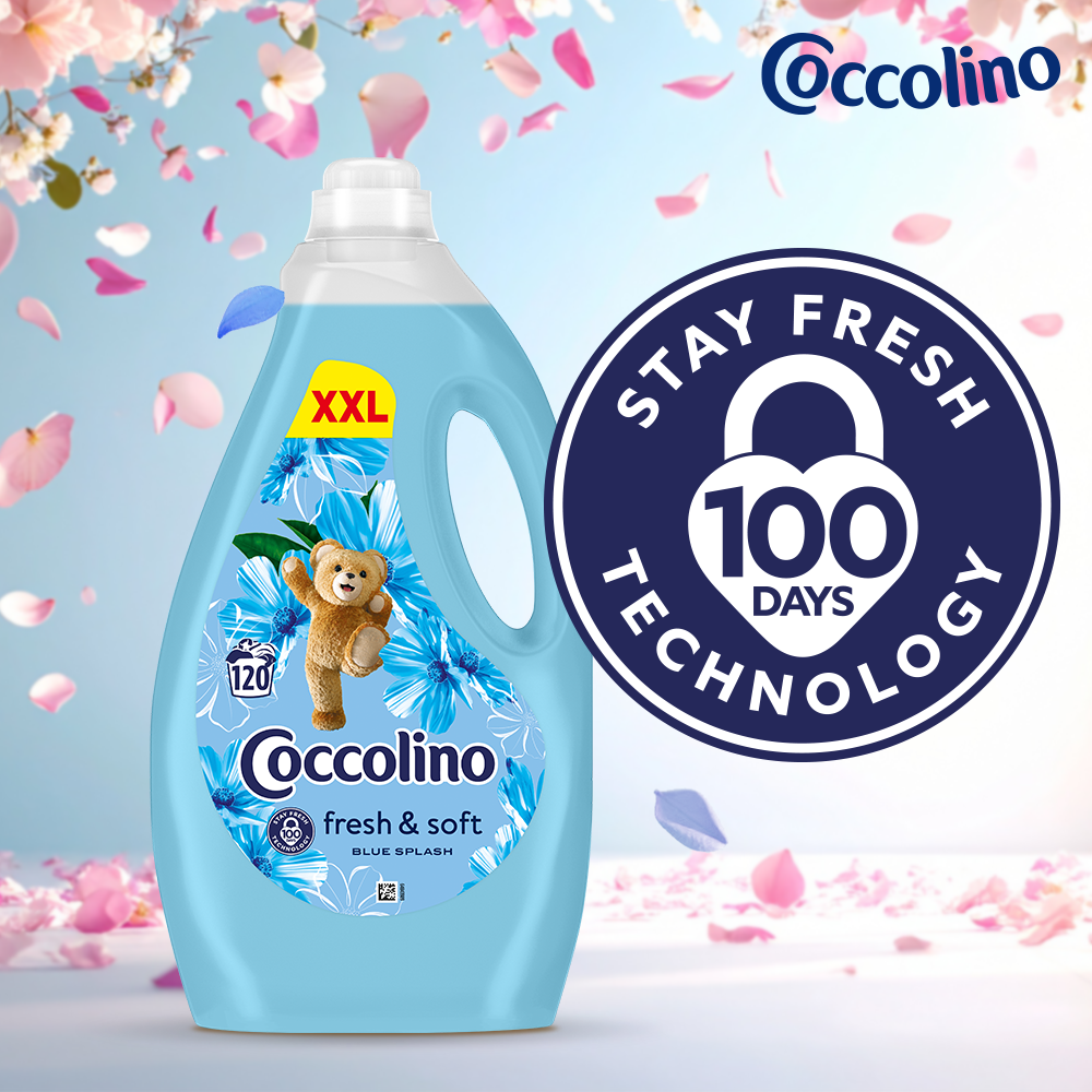 Dzięki technologii Stay Fresh, płyn do płukania Coccolino Fresh&Soft Blue Splash powoduje, że świeży zapach utrzymuje się na tkaninach wyjątkowo długo – aż do 100 dni.