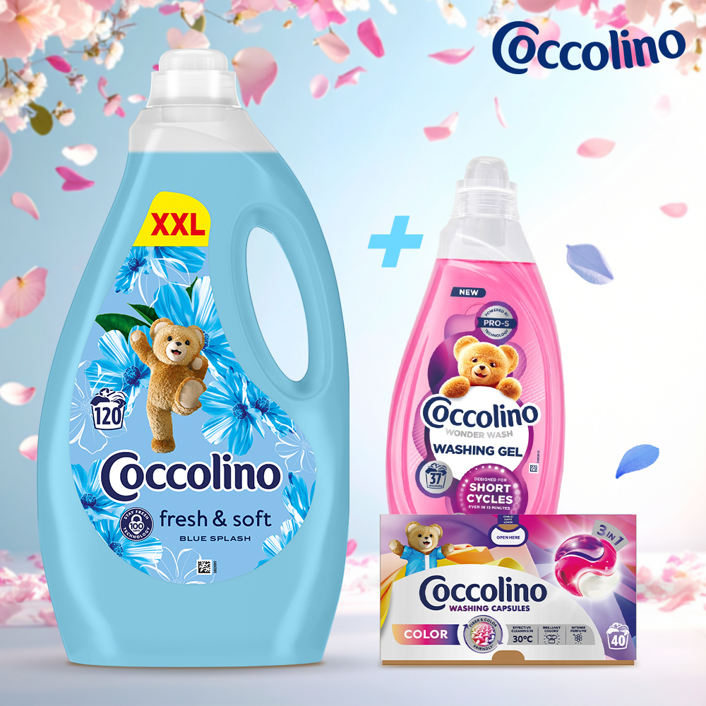 Aby uzyskać maksymalny efekt czystości, miękkości i świeżości, połącz płyn do płukania z żelami lub kapsułkami do prania Coccolino.